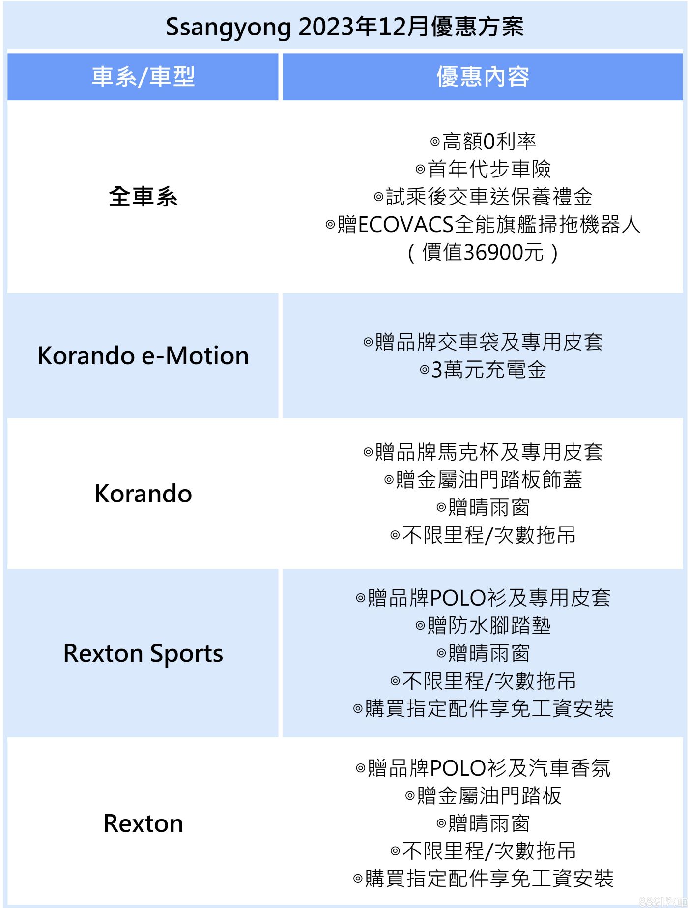永嘉雙龍汽車本月全車系購車同享高額0利率、首年代步車險等優惠,再送價值3.7萬的掃拖機器人,試乘並購車於交車後再送保養禮金,指定車系還有專屬配件禮。