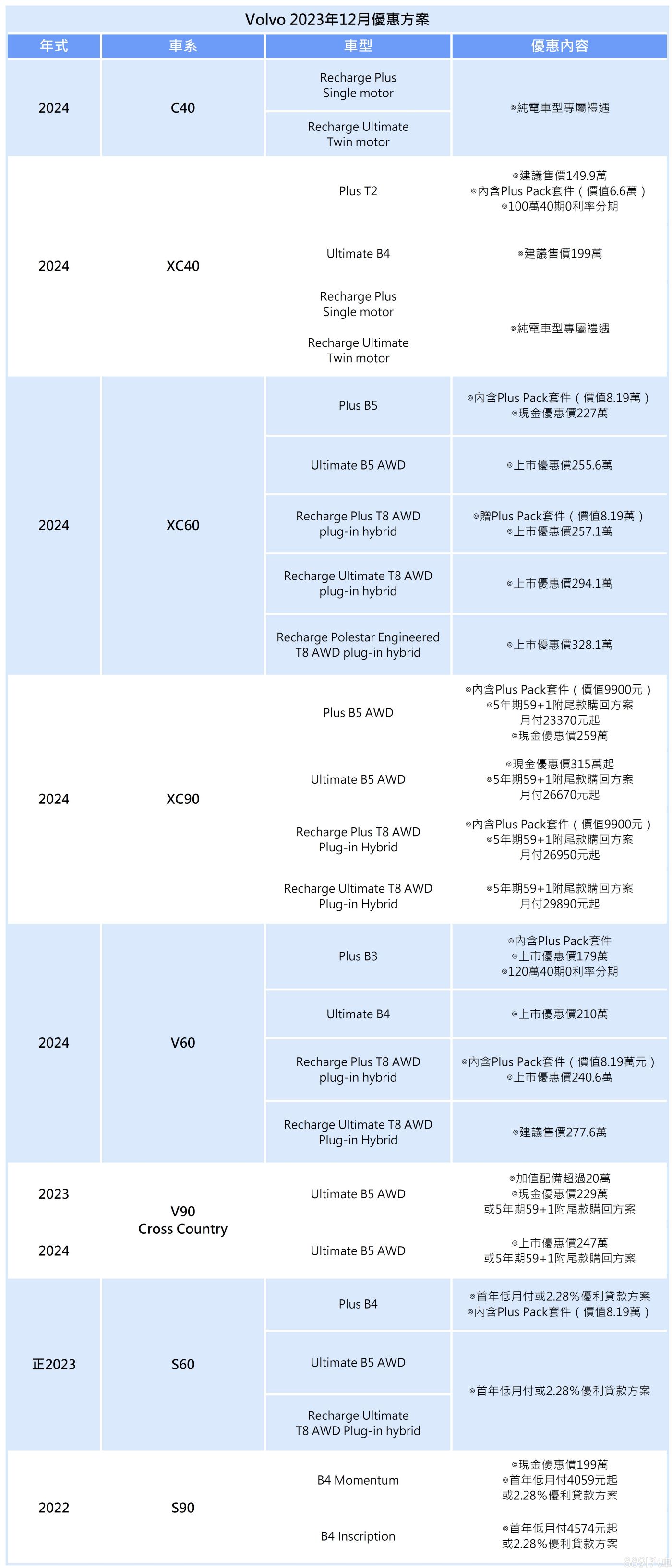 Volvo本月持續針對眾多車系推出專屬優惠,可享低頭款、超值購回方案或現金優惠價等,純電車型另享有專屬禮遇,部分新年式車型也推出上市優惠價。