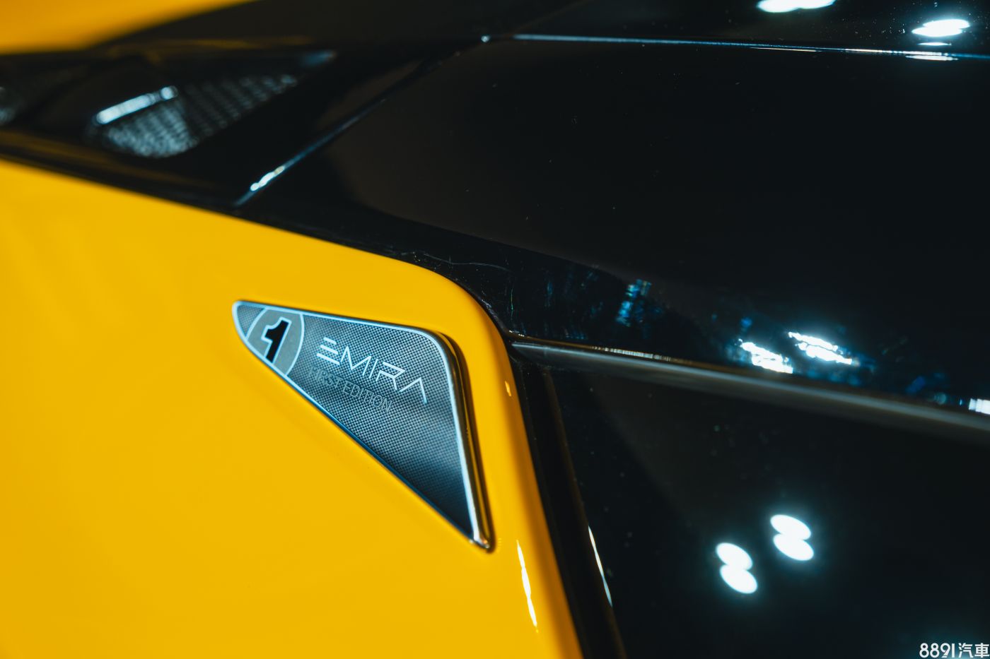 C柱旁有標示著First Edition的銘牌,新車標配黑色套件,於車身多處如前下擾流、後下分流器、車頂、車外後視鏡蓋、車尾Lotus標誌、尾飾管等處施以黑色塗裝,國內導入的車型可選灰、黃、藍三種車色。