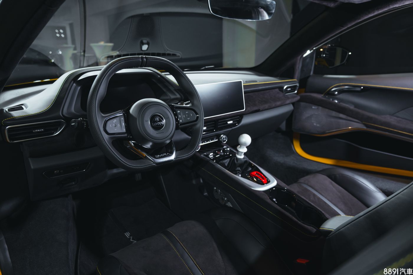 車室可選配黑色麂皮內裝套件,增添些許競技氛圍,標配12.3吋數位儀錶、可支援Apple CarPlay和Android Auto的10.25吋的中央觸控螢幕、與英國KEF聯手打造的10聲道高階揚聲系統、定速巡航、電動收摺後視鏡、倒車顯影、包含於Lotus Drivers Pack中的起步控制系統等。