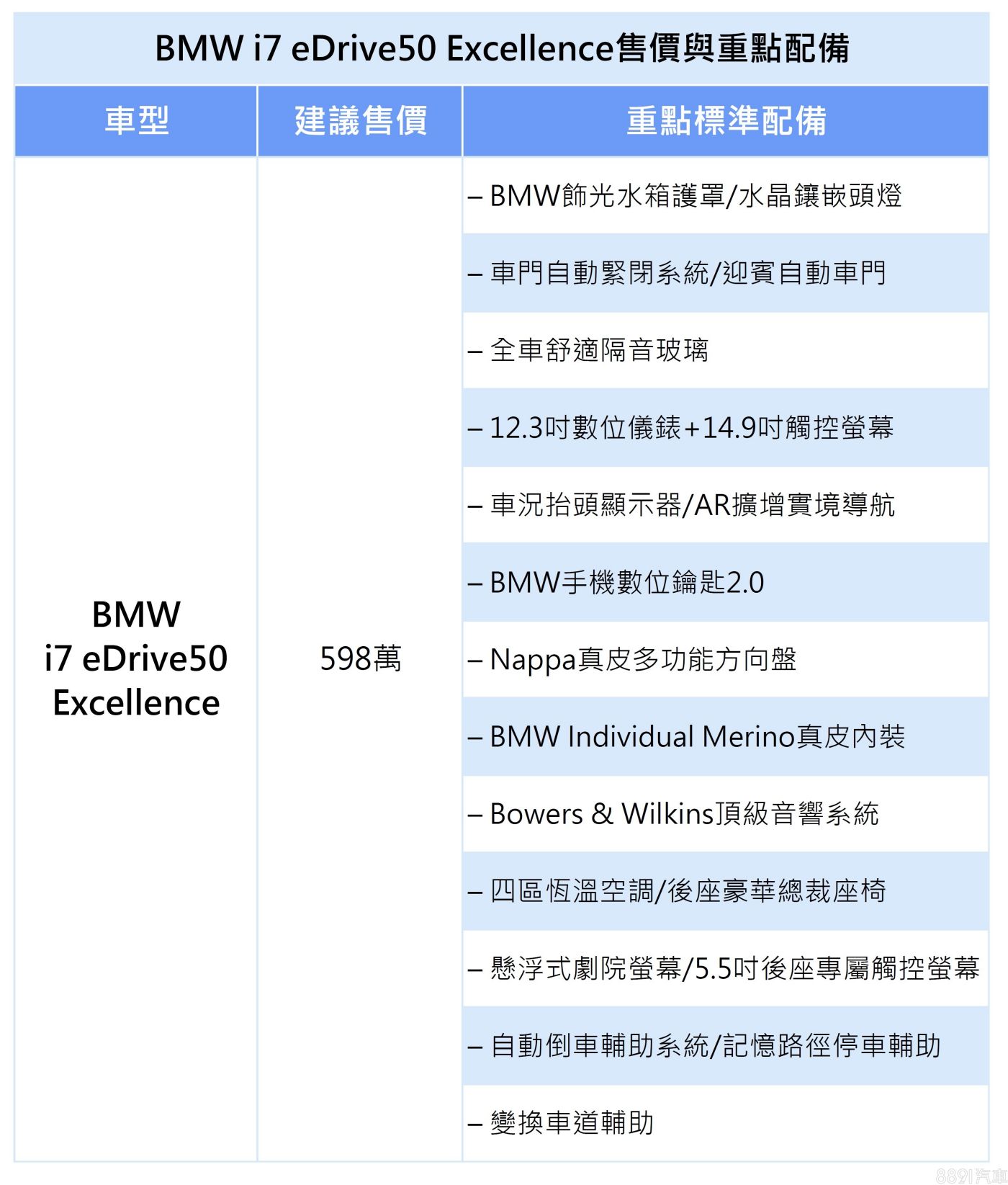 BMW i7去年底在台上市,首波導入「xDrive60 Luxury」與「xDrive60 Excellence」兩等級,建議售價分別為655萬與698萬,不過新年式後,上述兩版本皆已停售,汎德改導入「eDrive50 Excellence」作為基本款,開價598萬,並預告2024台北車展就可以看得到!
