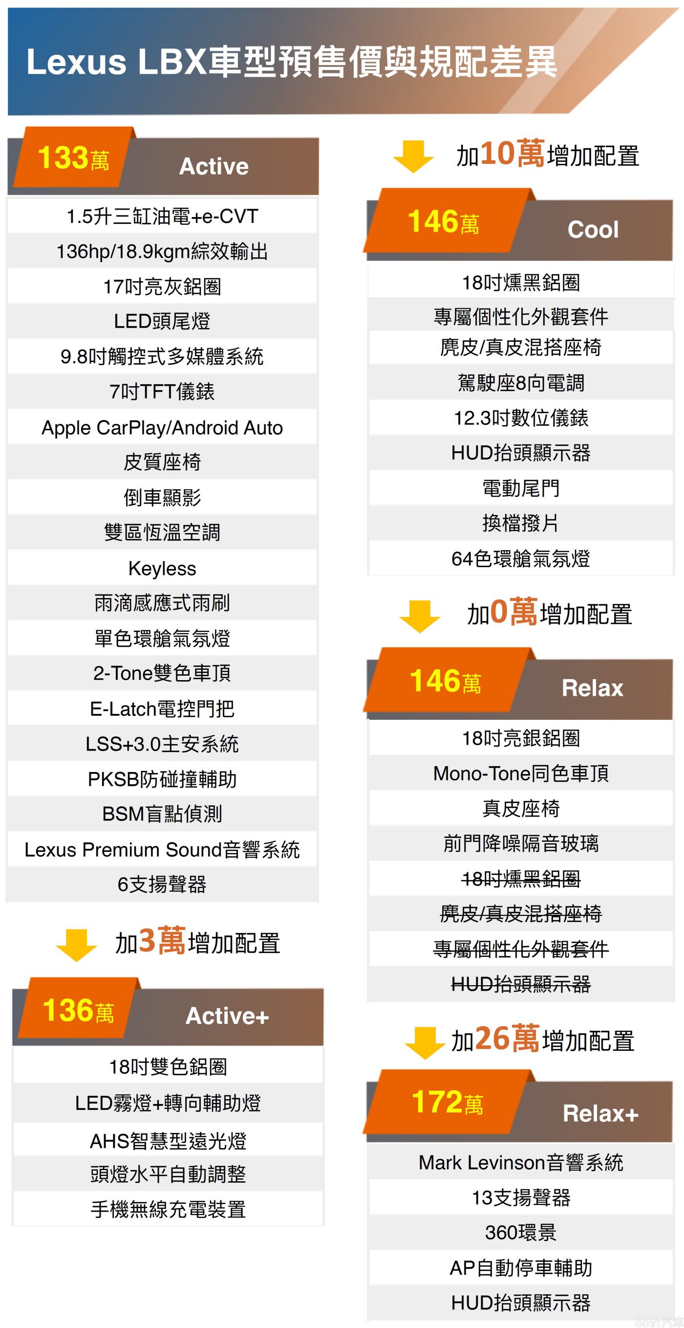 LBX是一款定位在UX之下的小型跨界,採用集團GA-B平台打造,車身尺碼4190×1825×1560mm、軸距則為2580mm,基本可視作歐/日規Yaris Cross的雙生高級版,原廠已先行公布國內編成,國內提供Active、Active+、Cool、Relax及Relax+共5款車型,預售價分別為133萬、136萬、146萬、146萬、172萬元,正式發表則落在明年1/17號。