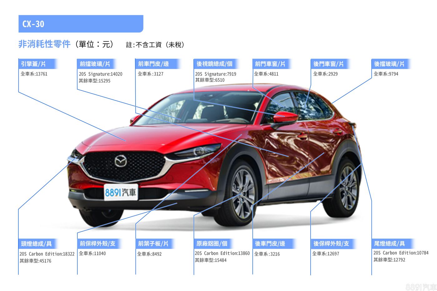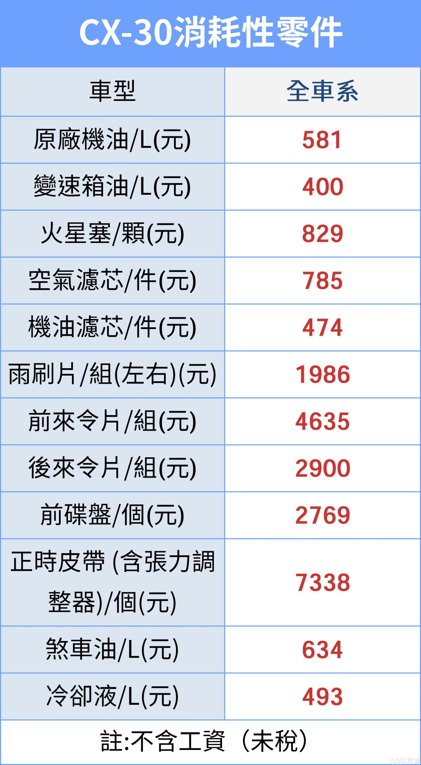 定保價格與國產車相當 2024年式CX-30車型選擇大幅縮減,從6車型編成調整為3車型陣容,在動力方面,統一搭載2.0升自然進氣四缸引擎,搭配6速手自排及前驅設定,因此定期保養費用全車系相同,原廠保養週期為1萬公里進廠,以表列看起來,僅雙數2、4、6萬需要較大幅度保養作業,但也沒有特別昂貴,整體保養價格僅比國產稍貴一些,算是好養的進口小跨界。