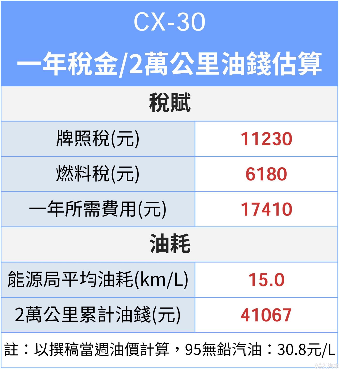 CX-30位處1.8~2.4稅金級距,年度牌燃費合計17410元,相較於同級跨界排氣量多在1.8升內,每年將多出5490元稅金支出。至於油耗表現,CX-30在沒有待速熄火設計的前提下,還是可以繳出15.0km/L的高速、市區平均油耗,日常通勤經濟性還不錯。