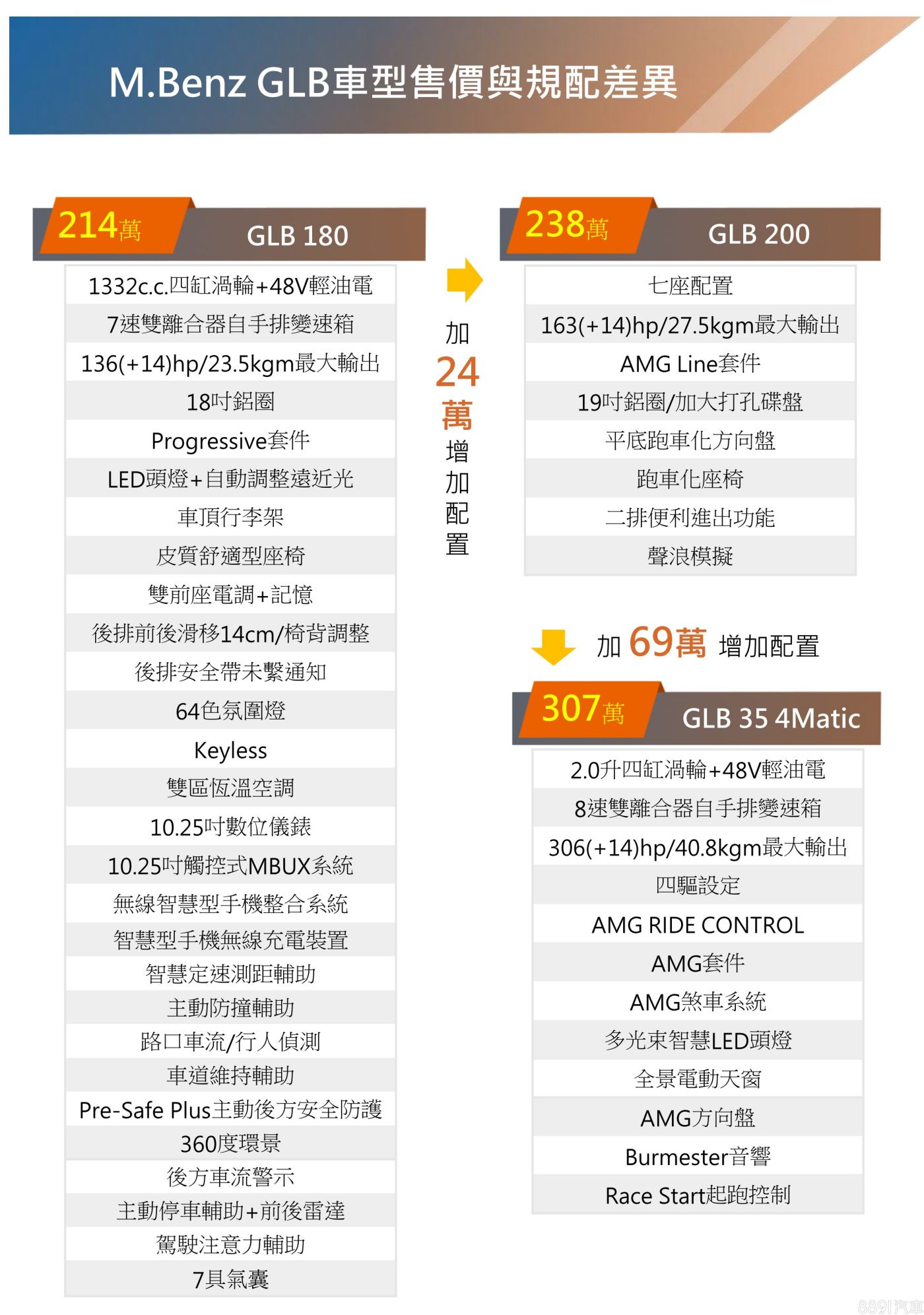 等待已久的小改款賓士GLB,總算在國內開賣了。車系編成比照相同開發基礎的GLA,提供GLB 180、GLB 200和性能導向的AMG GLB 35 4Matic,價格帶落在214~307萬元,相較小改前,AMG車型漲價7萬,非AMG款則有5萬漲幅。