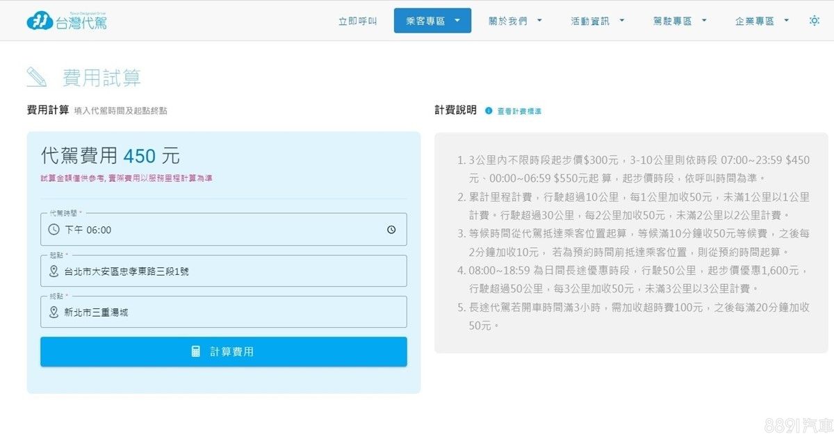以國內酒後代駕市佔率最高的「台灣代駕」做示範,其收費方式以3公里內不限時段起步價300元,3~10公里則依時段有不同收費,行駛超過10公里後,每1公里加收50元,若超過30公里,改為每2公里加收50元,若代駕抵達乘客位置,但消費者仍未準時上車,就得依規定收取等候費。目前,多數代駕業者無論是官網、App等平台都有提供費用試算功能,呼叫代駕前就能知曉大概金額。(圖擷取自台灣代駕)