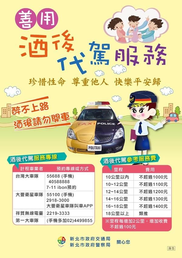 上述有提到,國內法規有要求代駕業者需公開收費標準,且避免業者漫天喊價,地方政府也有訂定「服務費用參考價格」,規定收費上限,以「首都生活圈」雙北為例,里程在10公里內收費不得超過1000元,此後每增加2公里加收費用不得超過100元,以此類推。(圖/新北市政府警察局)