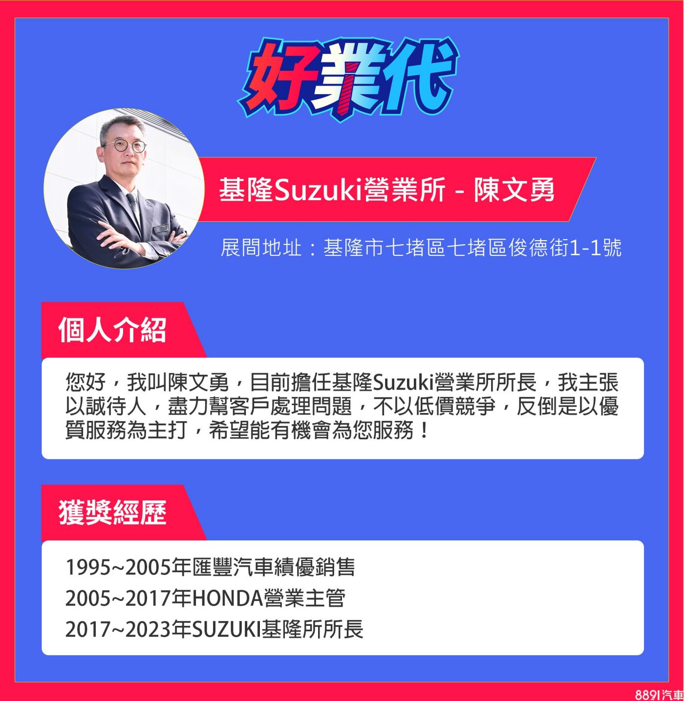 身分跟以往站內採訪過的銷售業代不同,文勇是代表基隆Suzuki營業所的所長,本身其實不掛任何銷售業績,主要工作內容是負責整個營業所的管理與經營業務,但他也必須維持整個營業所的銷售數字,若旗下業代銷售表現不理想時,文勇同樣得親自出馬,到第一線參與車輛販售工作,好達成階段性業績目標。