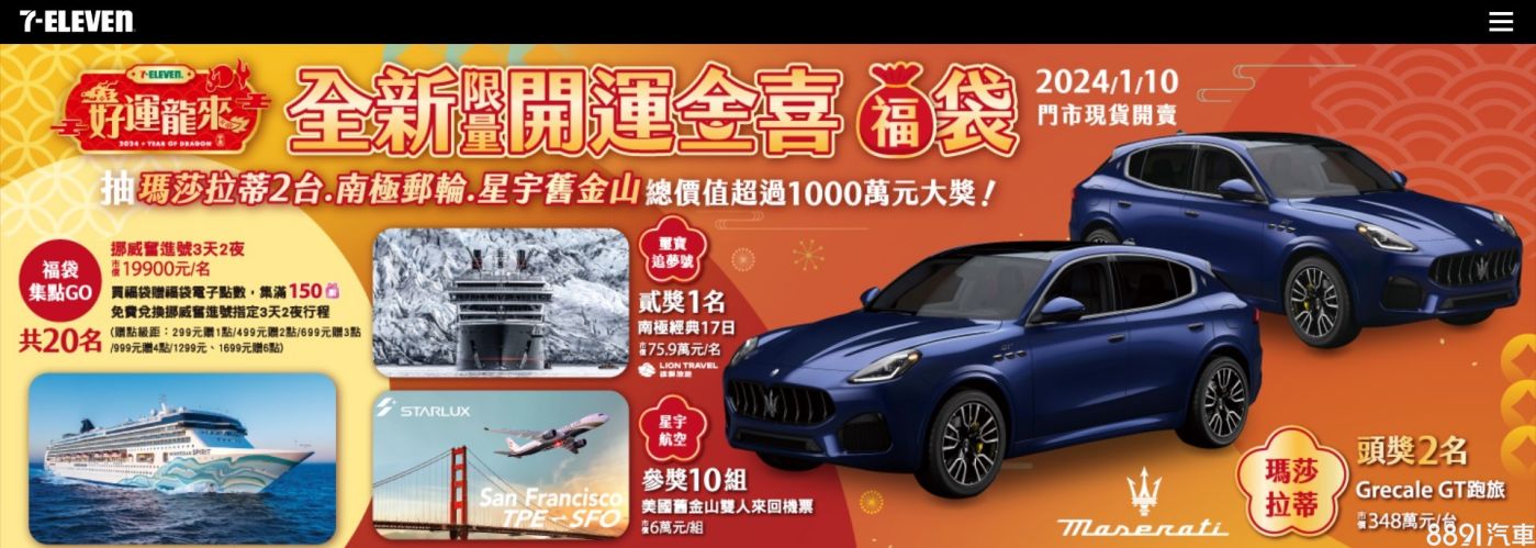 全家便利商店福袋的最大獎車輛是賓士B 180,價值比不上7-11的瑪莎拉蒂Grecale GT,但數量更多,福袋價格統一為249元,開獎時間是3/15。