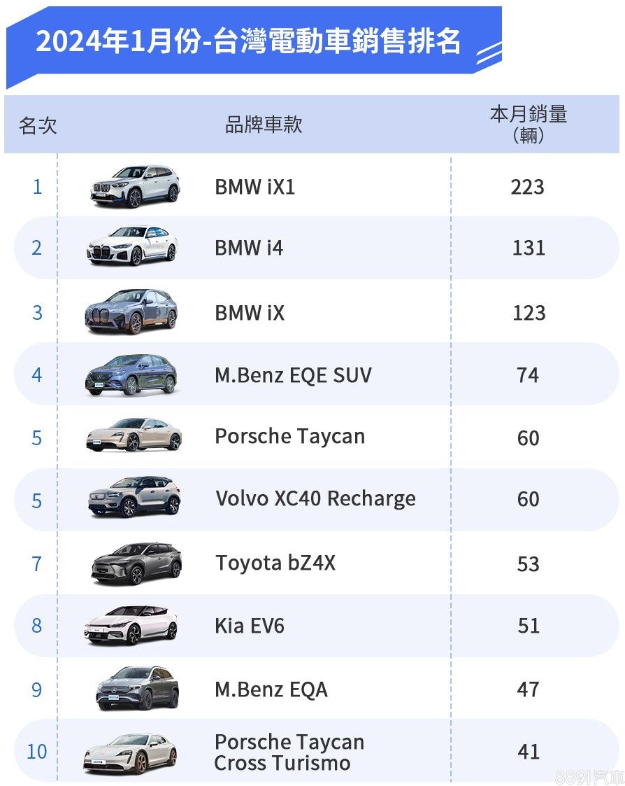 1月Top3電動車全由BMW拿下,不僅是榜中唯三有三位數掛牌數的車款,品牌現售最入門的電動車iX1,更以223台的月銷量取得市場冠軍頭銜,i4與iX則均以百餘輛的表現緊追其後。