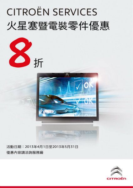 CITROËN SERVICES原廠零件優惠活動實施中, 4-5月火星塞及部份電裝品特惠8折,提供您優惠的價格,體驗原廠零件及服務品質。歡迎活動期間至全台CITROËN授權服務廠由合格技師提供診斷建議,CITROËN SERVICES原廠零件優惠活動相關訊息,歡迎洽詢各地CITROËN授權服務廠。
