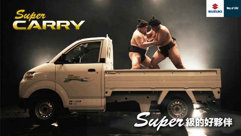 為顛覆商用車的刻板印象,TAIWAN SUZUKI於2015年3月為SuperCARRY再創新思路出區,推出全新廣告『Super級的好夥伴-相撲篇』,推翻傳統商用車的廣告手法,以獨樹一格的創意安排,充分表現出車台的大空間與相關性能,開創商用車全新的廣告方式,饒富趣味的畫面衝擊,令人耳目一新,為SuperCARRY創意了鮮明的形象。