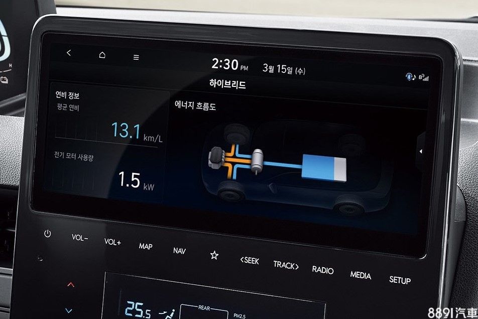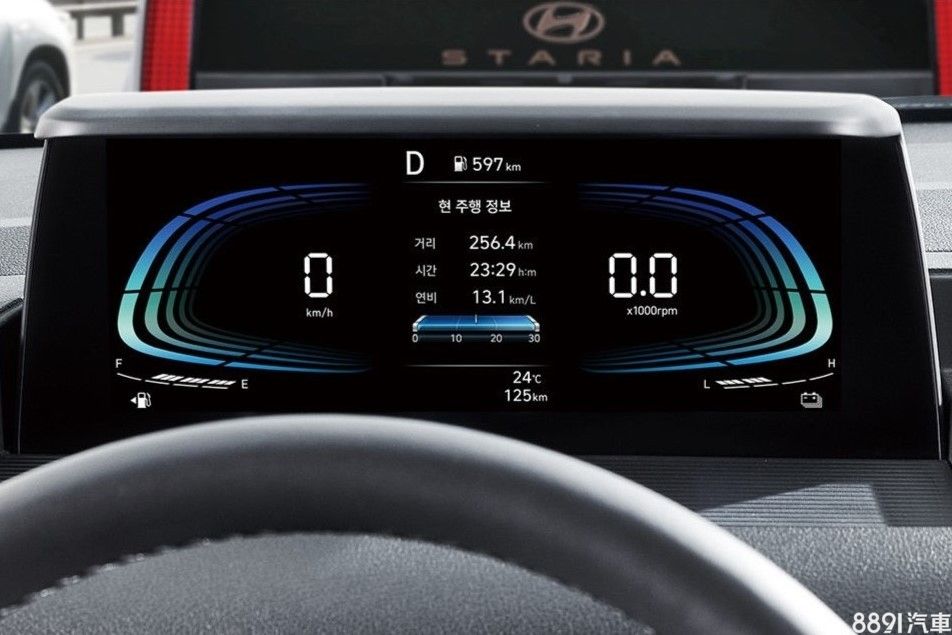 韓國販售的油電Staria座位配置比照柴油版,同樣提供有3~11人座位的車型可選,內裝除了入門版之外,均搭載8吋數位儀錶及10.25吋多媒體觸控螢幕,兩個螢幕均有因應油電車型加入電量表或動力流的顯示畫面。此外,新年式針對配備作升級,包含導入新一代智能鑰匙、Type-C規格USV插槽,以及為了安全考量,將電動尾門啟閉速度放。