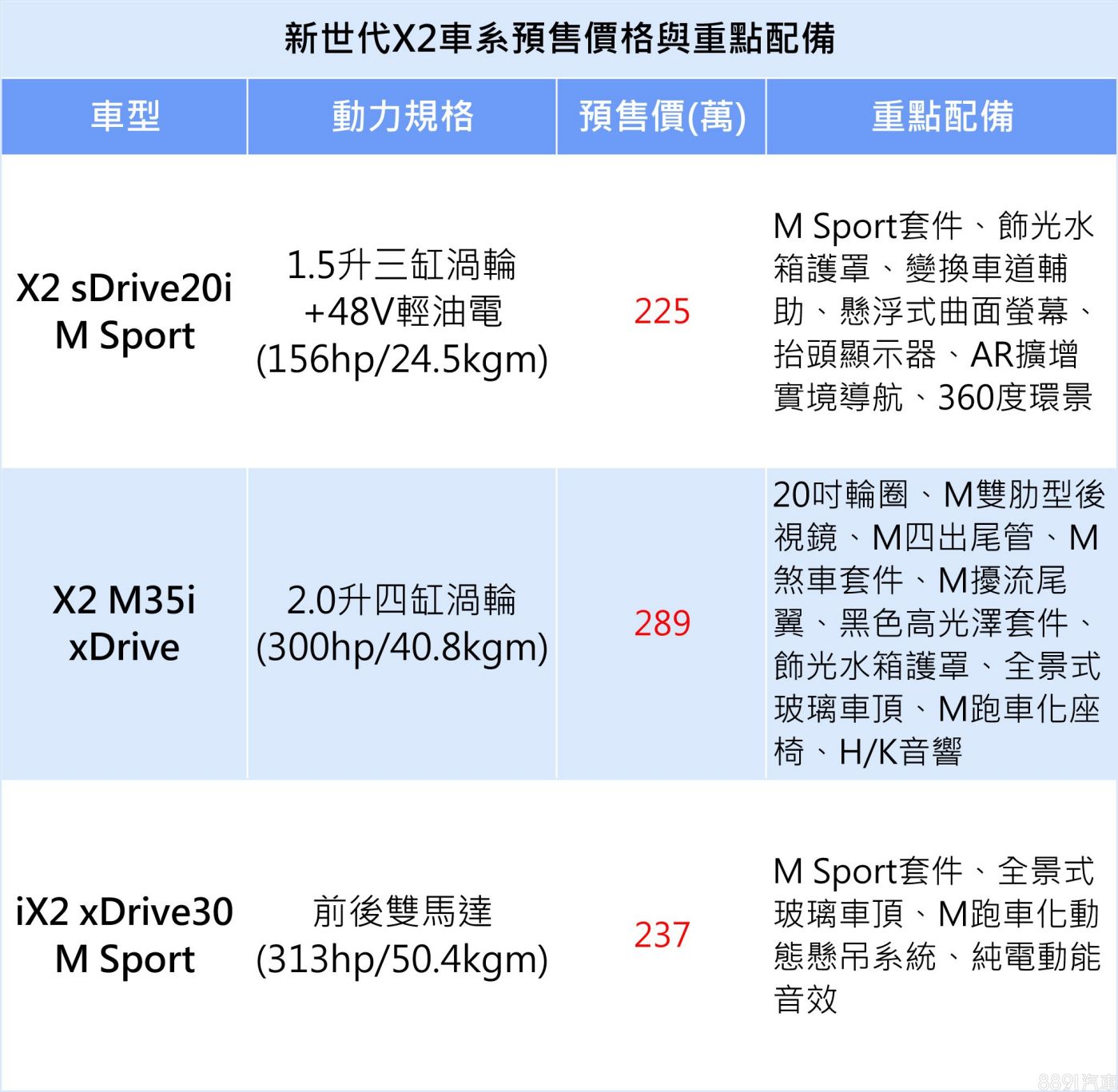 參考預售陣容,新X2首批將導入1.5升三缸輕油電的「sDrive20i」、2.0升渦輪四缸的「M35i」,以及搭載雙馬達四驅純電動力的「iX2 xDrive30」,三車型預售價格帶落在225~289萬元,不過正式售價仍不排除有微調可能。