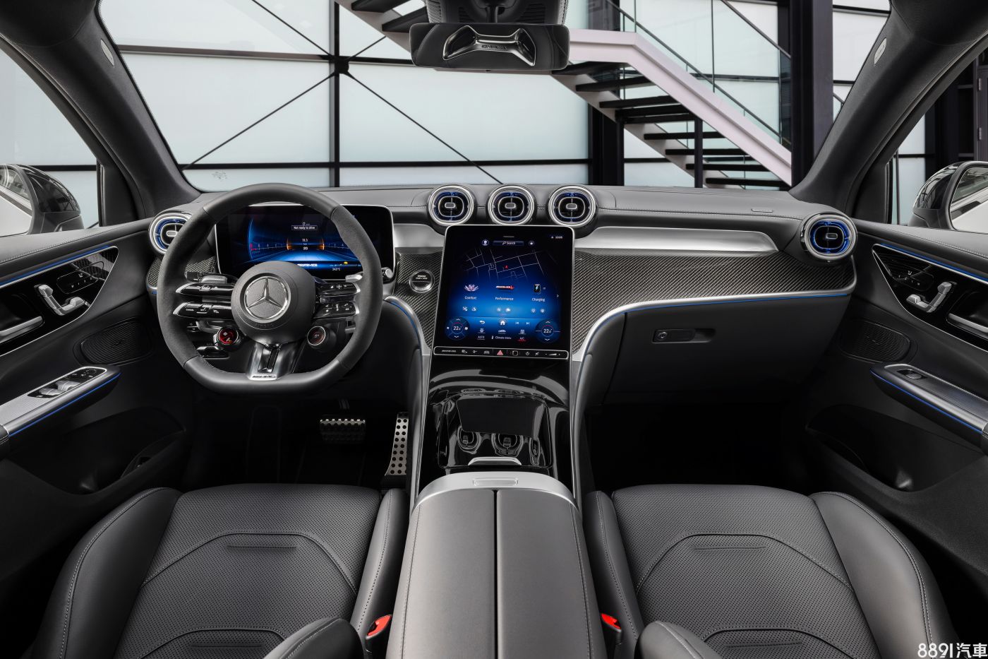 不論43或63,兩款AMG GLC Coupe內裝視覺差異不大,63配備上多了紅色安全帶、HUD抬頭顯示器和引擎聲浪調整功能,並針對車載系統加入擴增實境導航和AMG Track Pace賽道程式。