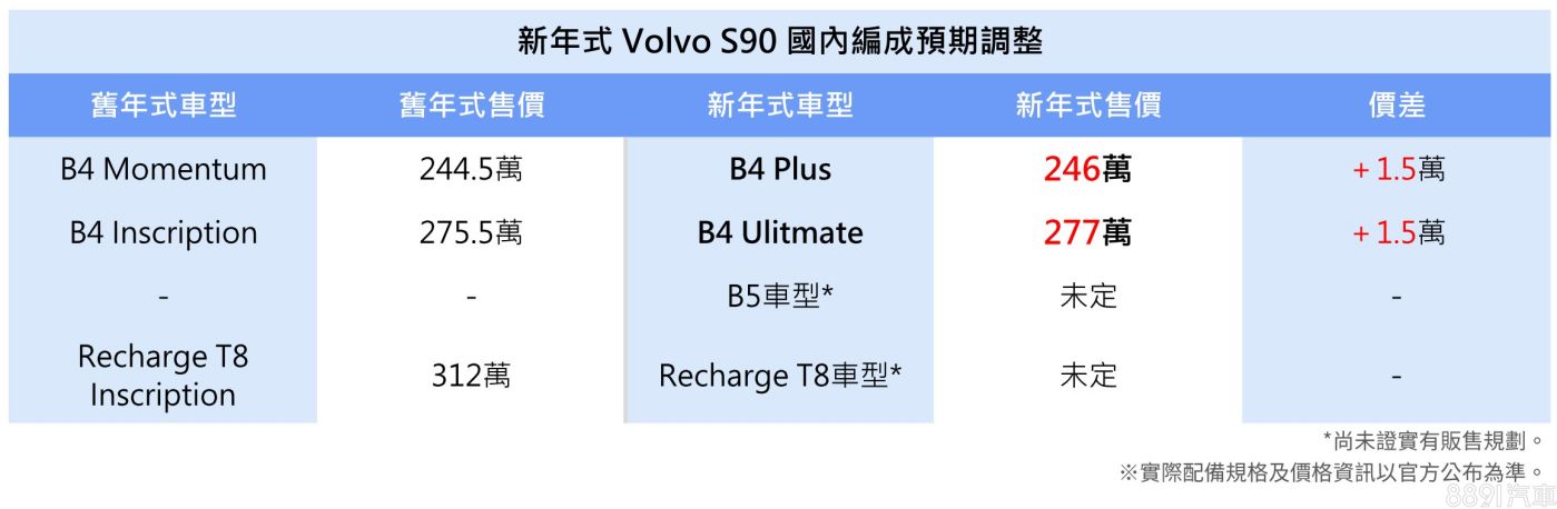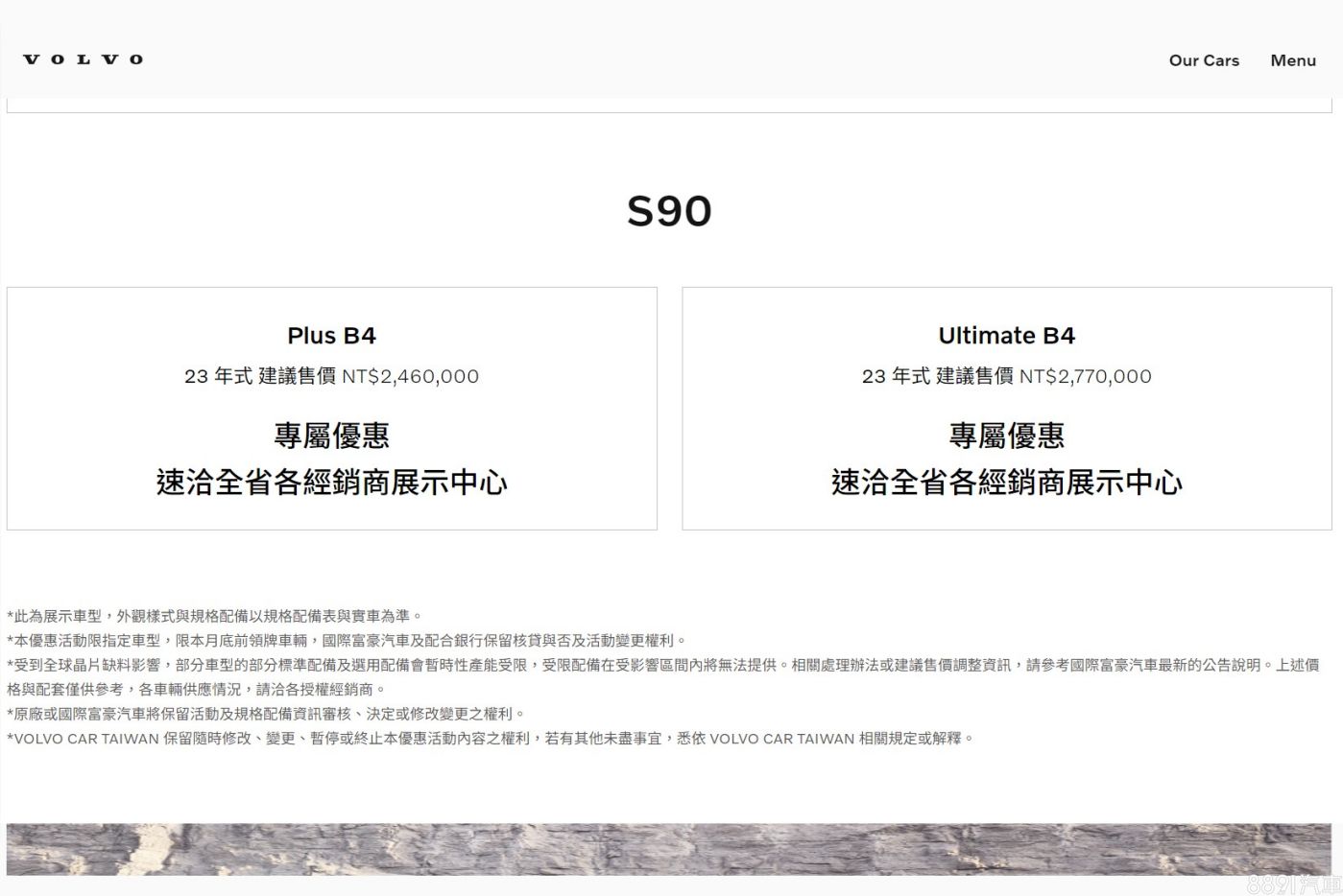 Volvo S90計畫在台灣推出新年式車型?S90車系目前仍以22.5年式販售中,供應兩款「B4」和一款PHEV油電的「T8」車型,不過官網已經悄悄放上23年式的接單消息,曝光兩款B4車型將更名為B4 Plus與B4 Ultimate,並均調漲1.5萬,新年式定價分別為246萬與277萬。