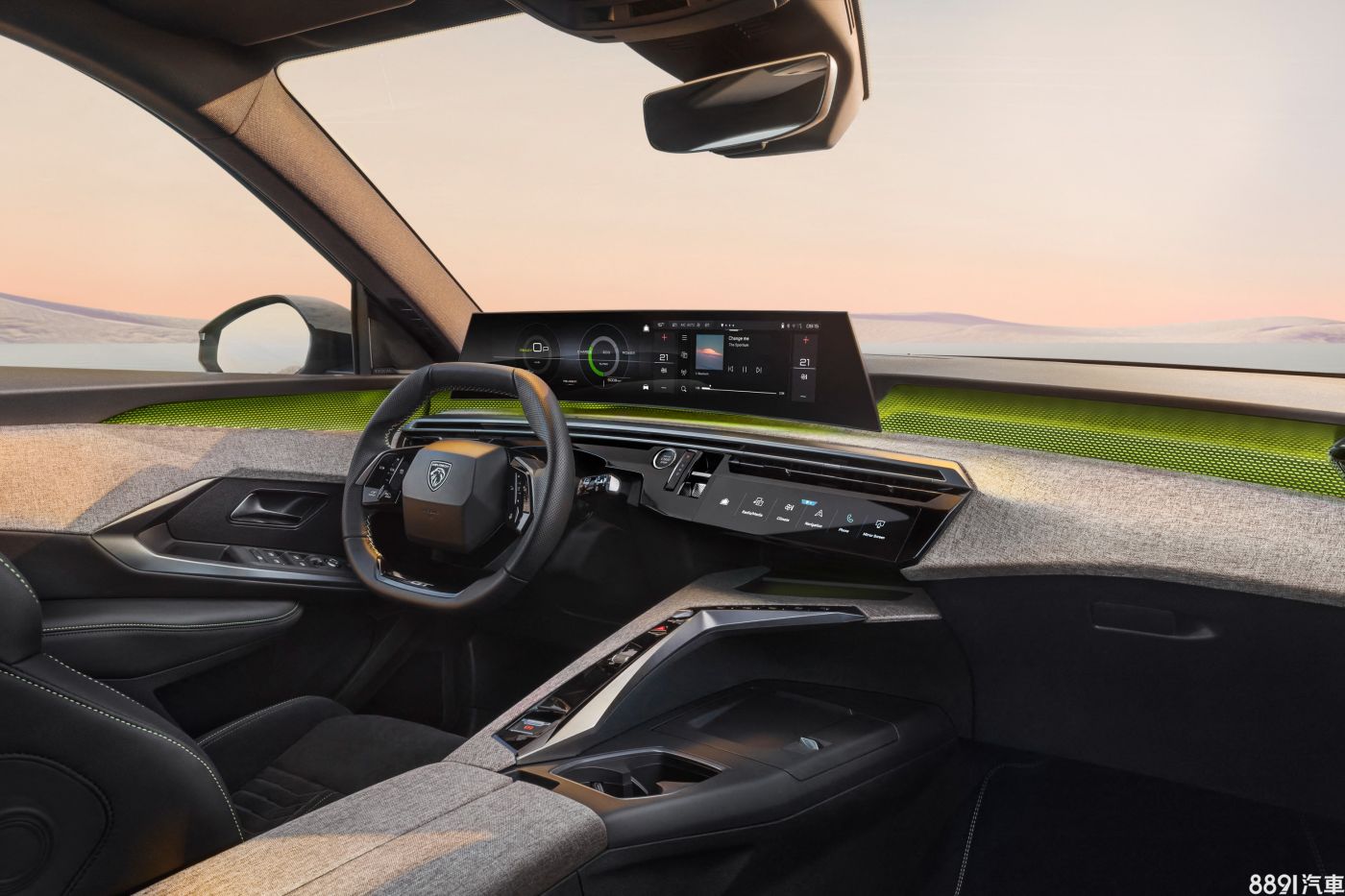 座艙說是從3008複製貼上亦不為過,採造型立體簡潔、駕駛座導向的布局,圖中GT款並配備有專屬平底方向盤和21吋曲面螢幕,儀錶和多媒體系統分別佔據畫面左右兩側。