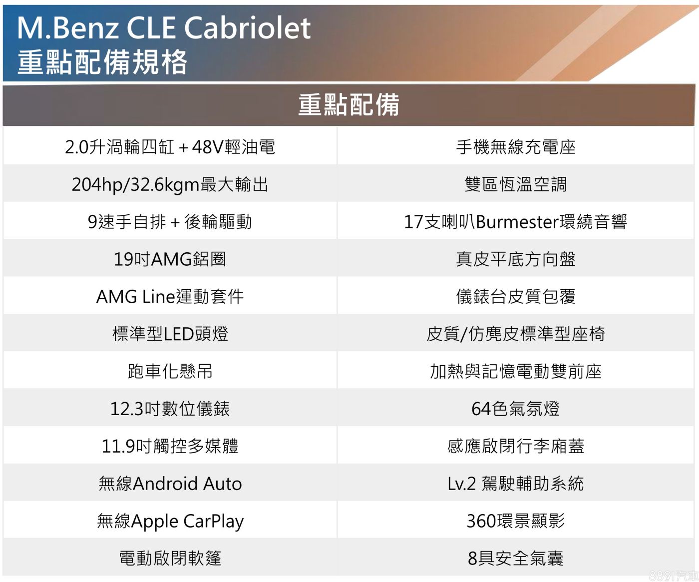 CLE是賓士的新雙門車系,作為雙門C-Class和雙門E-Class的共同後繼推出,國內宣布即刻上市,當中Coupe款供應288萬「CLE 200」、342萬的「CLE 300」和438萬的「AMG CLE 53」;敞篷款則採「CLE 200」 單一規格,開價321萬。