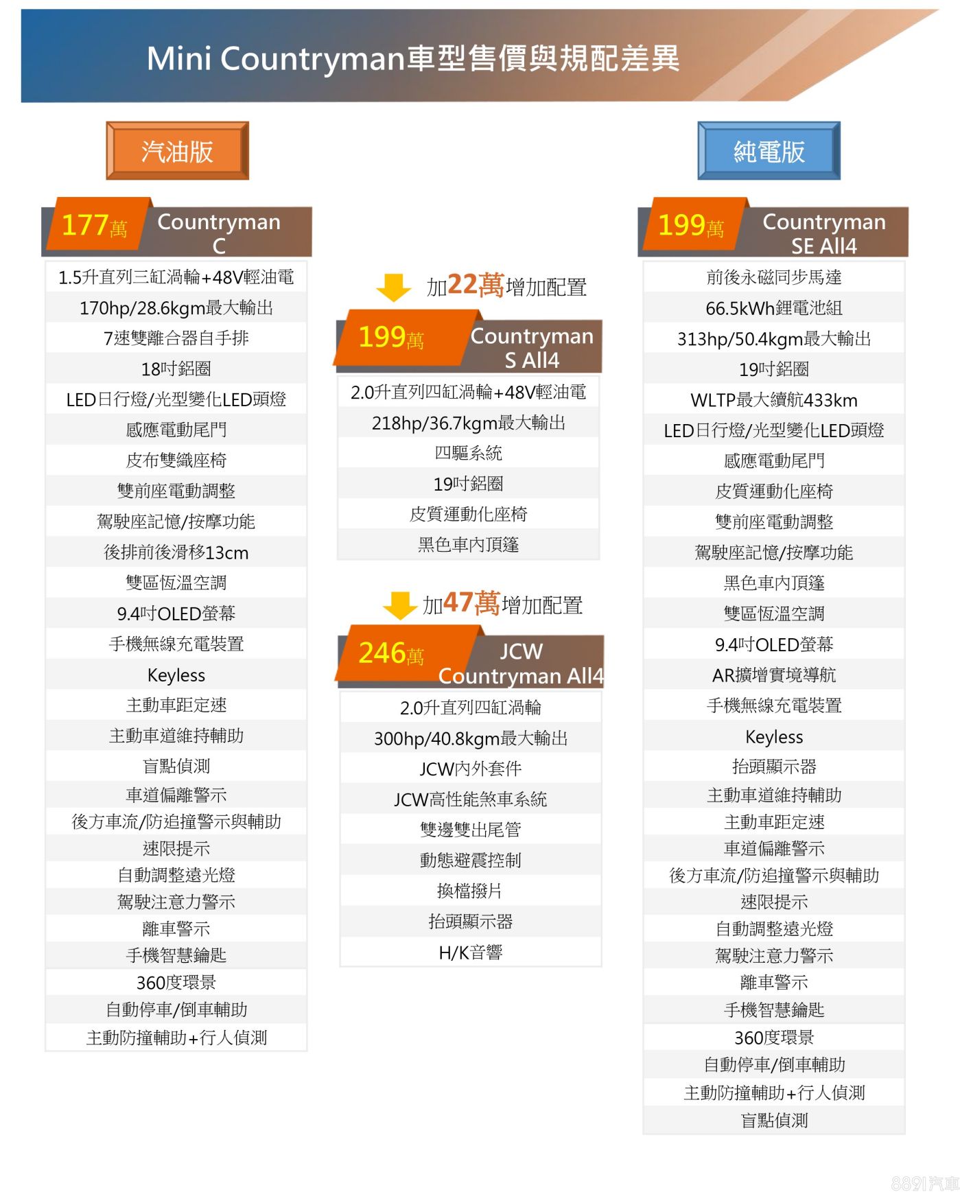 大改款Mini Countryman提供三款汽油車型和一款純電車型:Countryman C、Countryman S All4、JCW Countryman All4和Countryman SE All4,售價分別為177、199、246和199萬元,重點規配如附表。