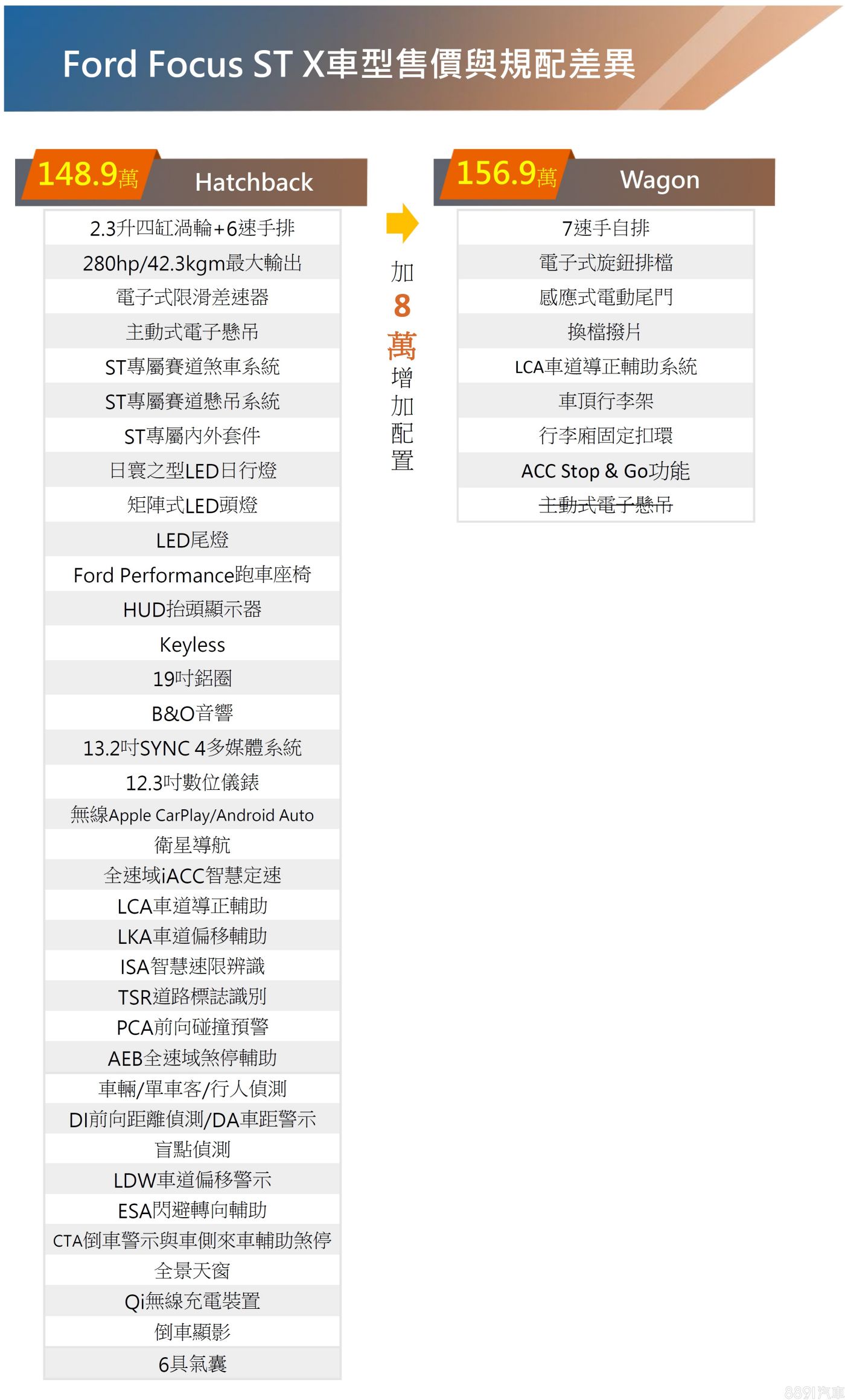 24年式的Focus ST家族持續提供掀背及Wagon雙版本:Focus ST X Wagon和Focus ST X Hatchback,售價分別為156.9、148.9萬元,與先前相比持平,配備方面也一如既往。