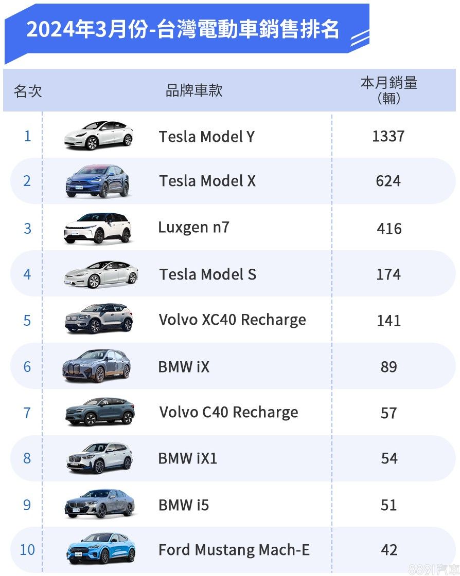 Model S則以174輛位居第四,是3月最暢銷的電動房車。但最意外的是,國產電動休旅Luxgen n7不僅連兩月登榜,3月也穩居第三,沒讓大量到港的Tesla前三全拿。