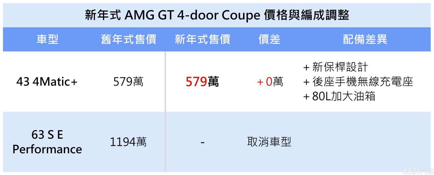 國內AMG GT 4-door Coupe推出新年式!主要針對車系編成做調整,取消原本搭載PHEV油電動力的「63 S E Performance」頂規版本,只留下「43」單一車型可選,雖說維持579萬的價格不變,但配備上略有調整。