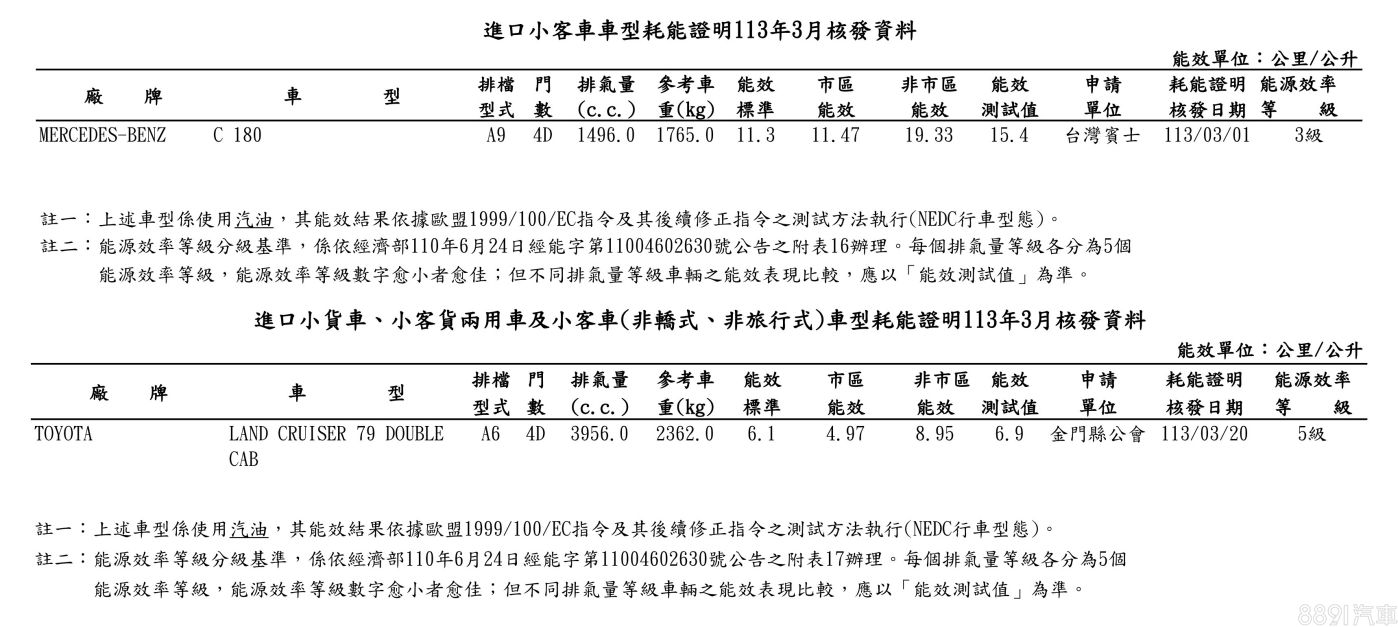 進口車方面,出現了一款Land Cruiser 79 Double Cab雙廂皮卡,不過送測單位並非品牌總代理,該車款亦非海外已經發表的新世代Land Cruiser系列車型,推測應為私人單位自行申請認證;至於M.Benz則重新送測了C-Class入門車型C 180。