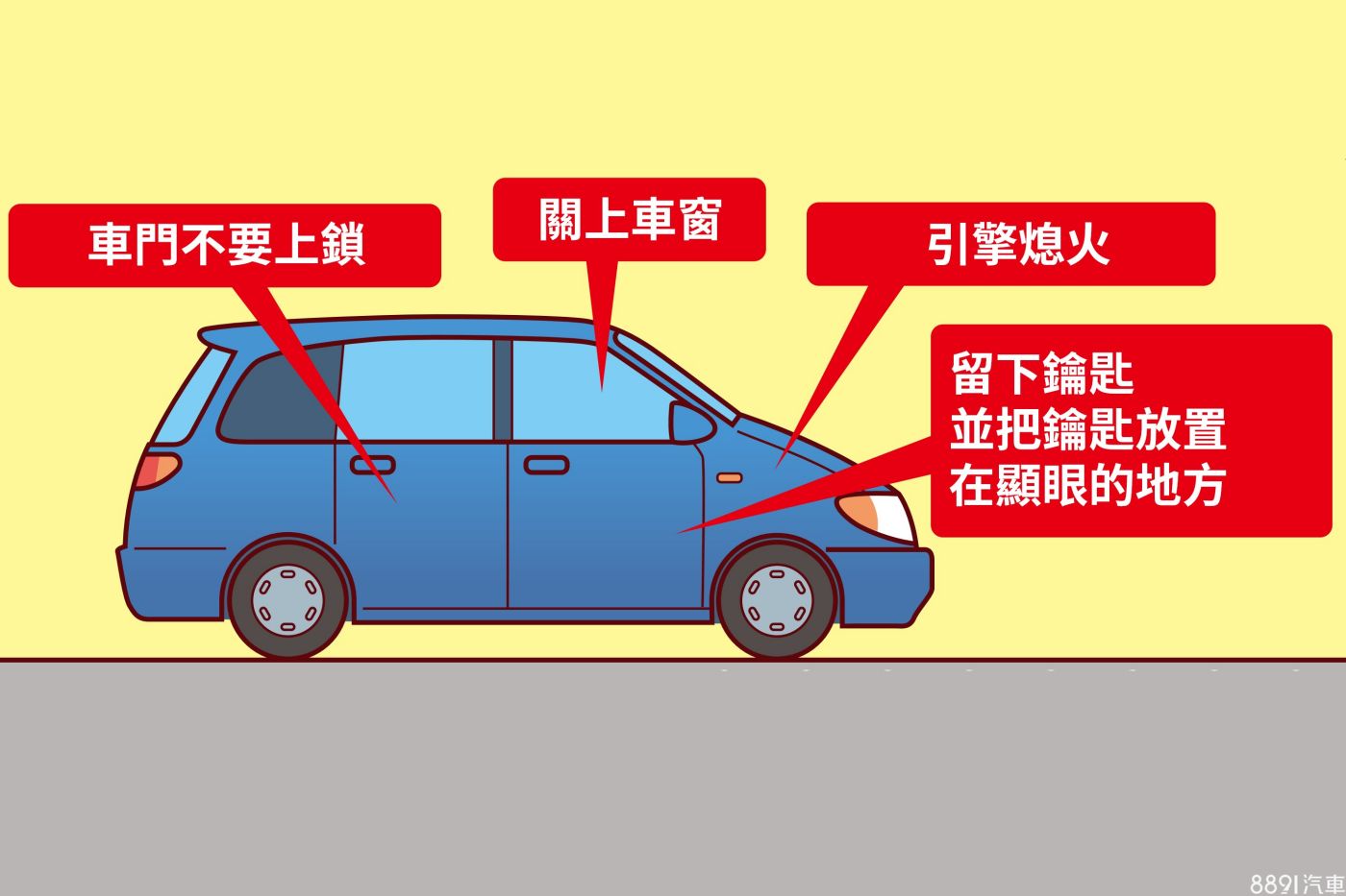 留下鑰匙是為了讓後續抵達現場的緊急救難人員,能盡速移車讓出通道,尤其避難前未能停靠至路邊的車輛更應如此。此外,如車上有手電筒、急救包、哨子等物品,若在狀況允許的前提下,可於避難時隨身攜帶,以備不時之需。(圖/⽇本⾃動⾞連盟)