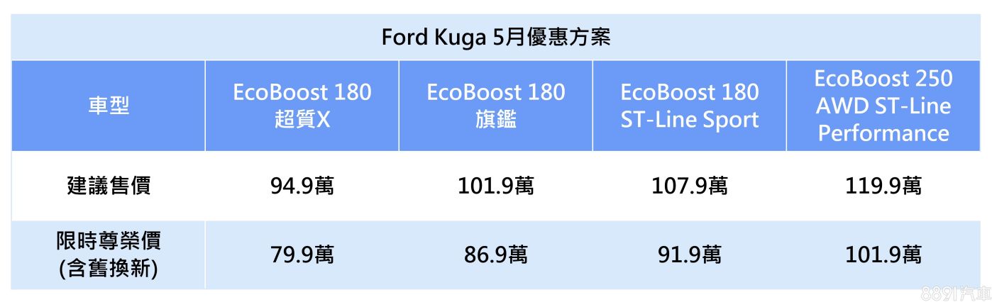 福特六和宣布,凡於活動期間5/1~5/31止,入主Focus Wagon ST-Line X版本,可享限時舊換新優惠價89.9萬、限量升級電動尾門,再贈首年乙式車體險、5年原廠保固及60萬0利率;而國產Focus全車系同享首年乙式車體險、5年原廠保固,指定車型(Hatchback X、Hatchback ST-Line Vignale、Active Vignale及Wagon X)再升級電動尾門或享最高80萬0利率。
