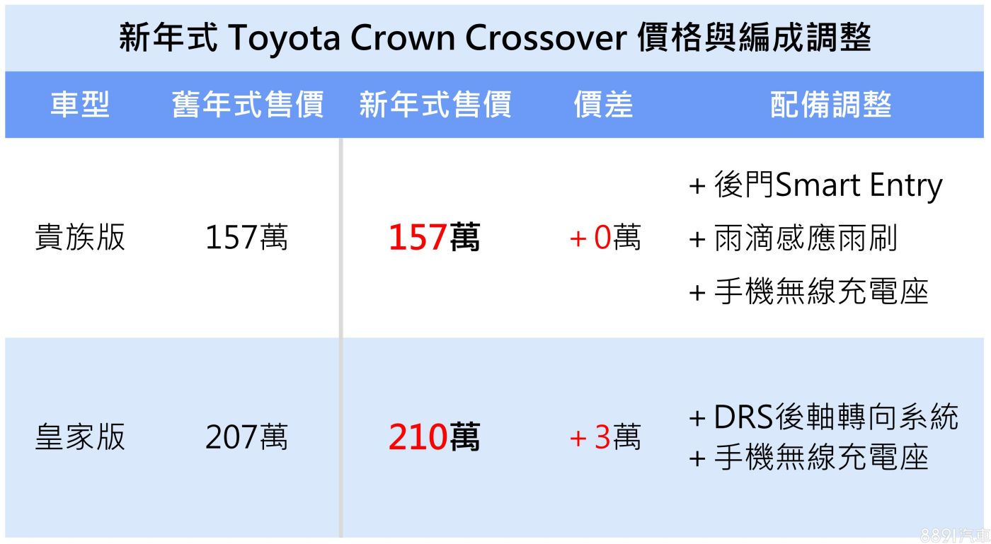 以「皇冠」做Logo的Toyota Crown Crossover,在台灣推出新年式更新。價格方面,入門「貴族版」維持157萬門檻不變,頂規「皇家版」則調漲為210萬,對比舊年式約有3萬漲幅,兩車型在配備上均略有調整。