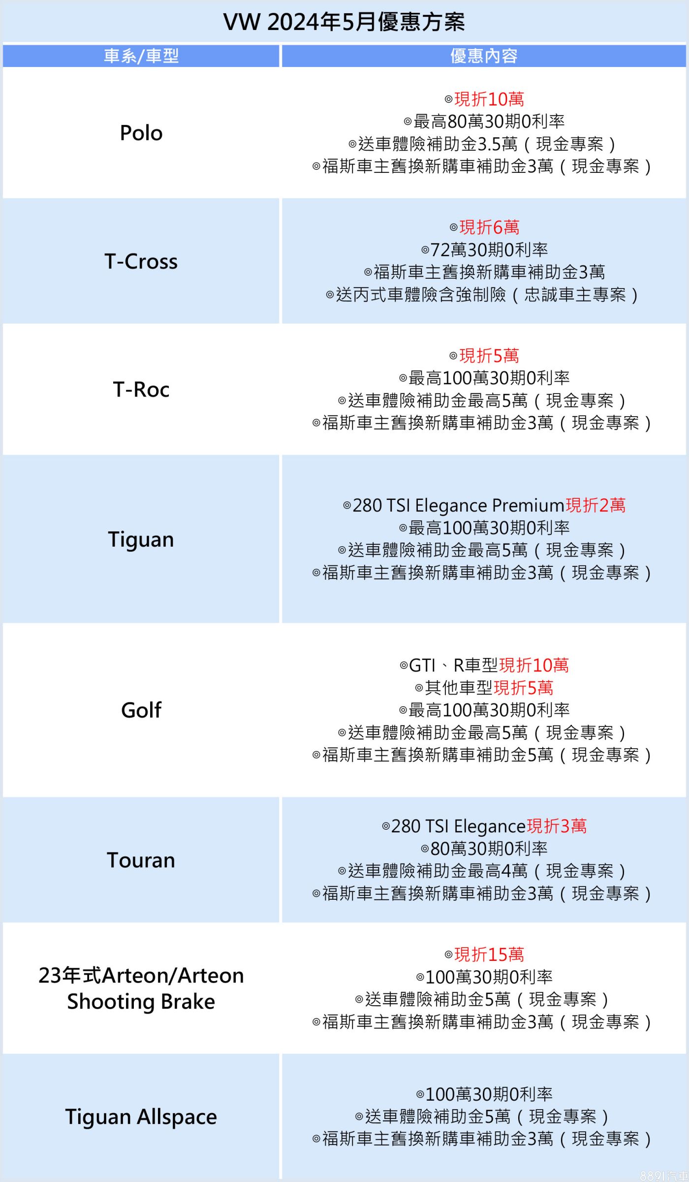 除了高額分期0利率,福斯5月優惠祭出消費者最有感的「折價方案」,包含Polo、T-Cross、T-Roc、Tiguan、Golf、Touran等車系2024年式指定車型,均推出「艷夏優享價」,下殺2至10萬不等。