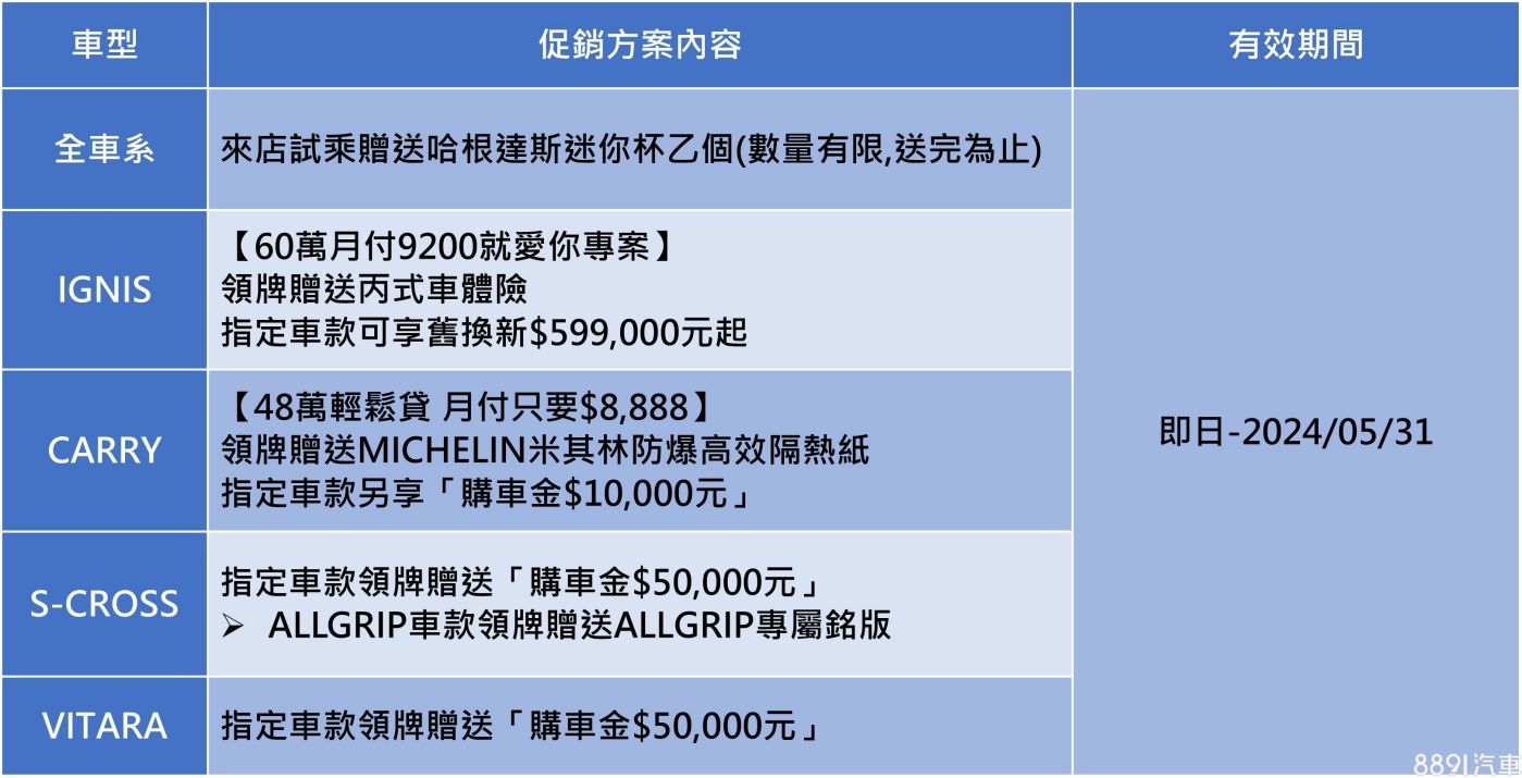 小貨車Carry則主打「月付8888」的48萬分期專案,5月完成領牌加贈米其林隔熱紙,指定車型則可享1萬購車金。至於,S-Cross和Vitara兩款休旅,則同步推出入主指定車型送5萬購車金活動。
