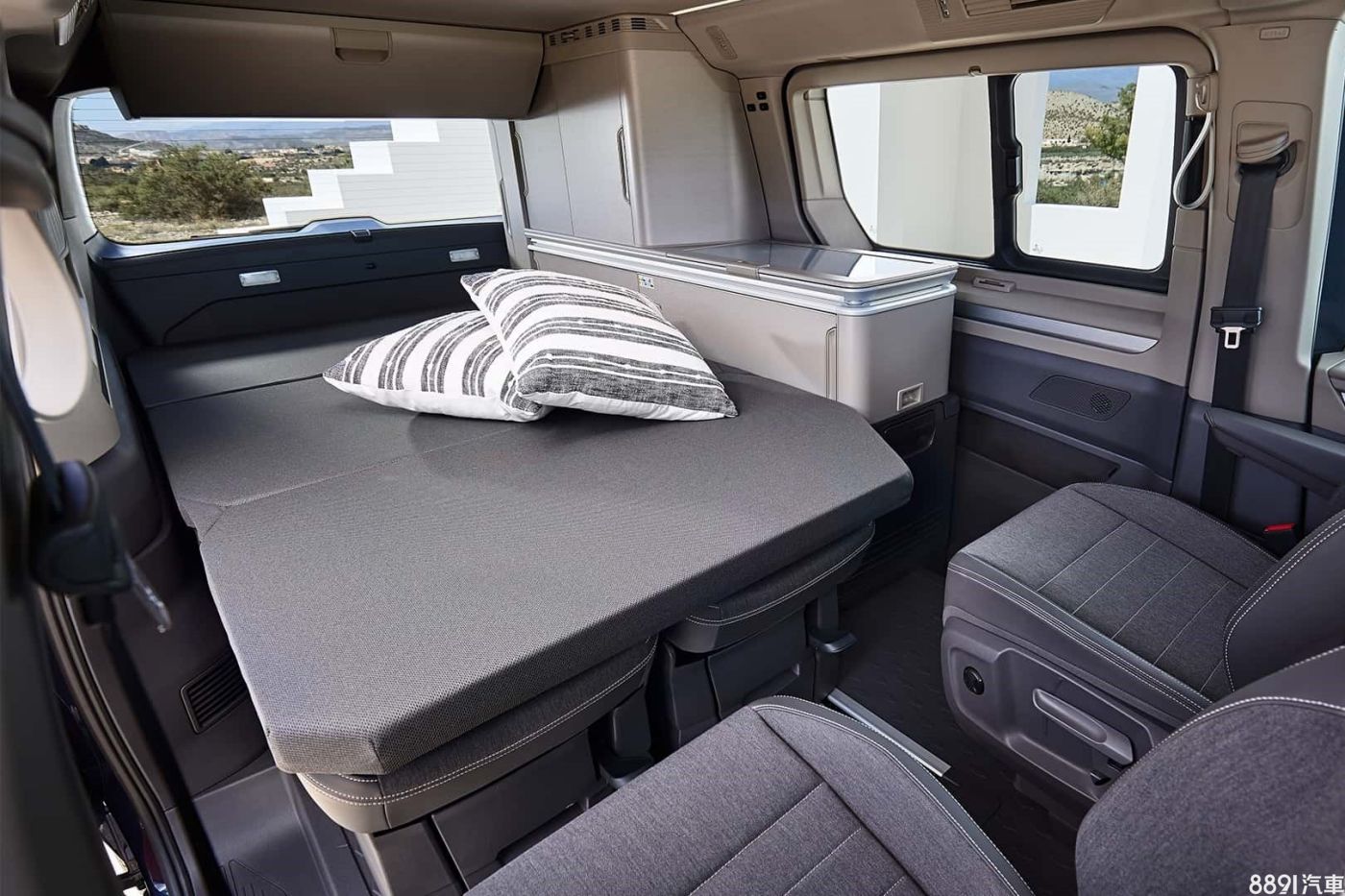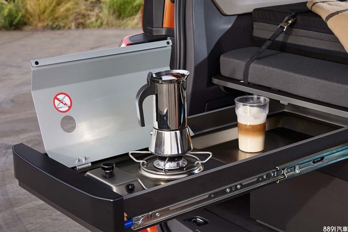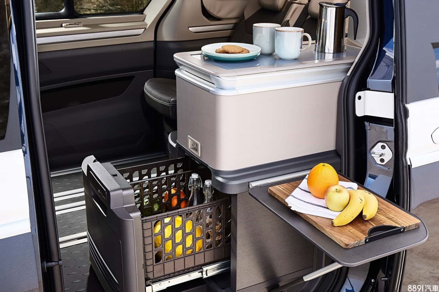小廚房經過重新設計,保有左側滑門進出空間,加上前座兩張座椅都能向後旋轉,創造開闊的廚房動線,側邊還有折疊小桌子可以使用。