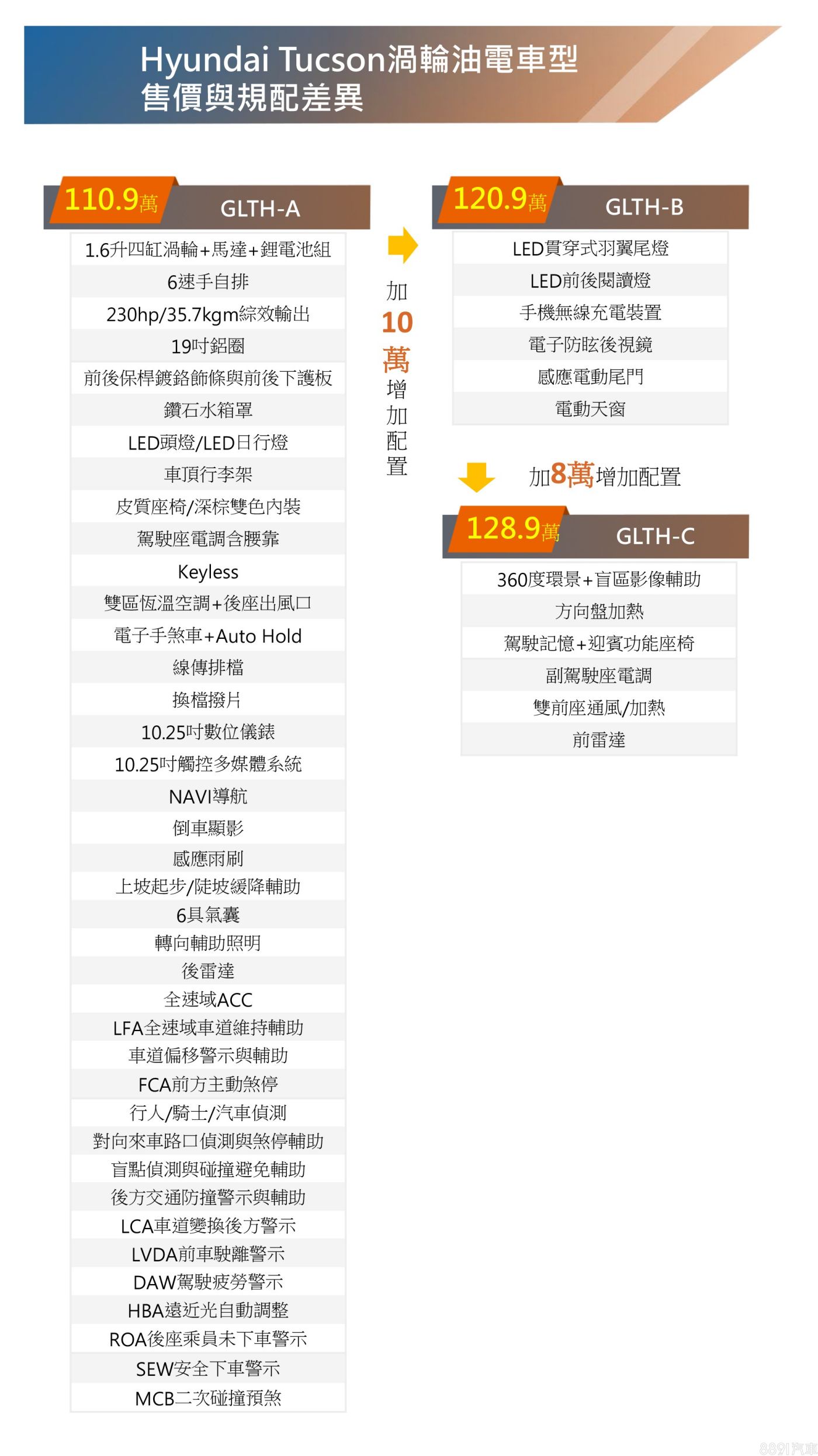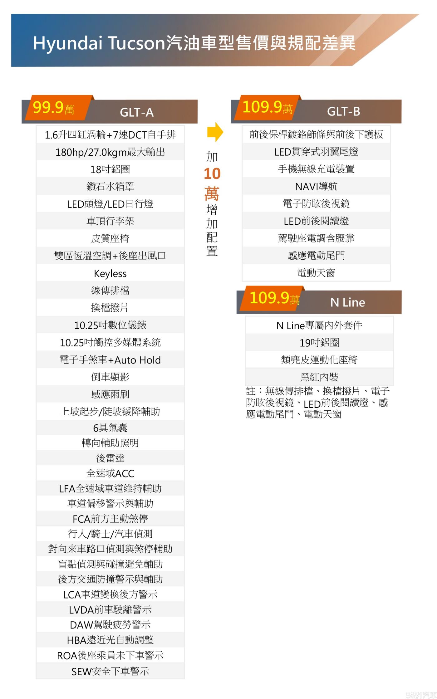 Hyundai Tuscon同樣提供汽油與渦輪油電雙動力,汽油版本方面,除了既有的GLT-A、GLT-B,追加N Line新頂規,分別開出99.9、109.9、109.9萬之售價,除了多出運動化選項,其餘車型價格沒變,配備方面也沒變化。