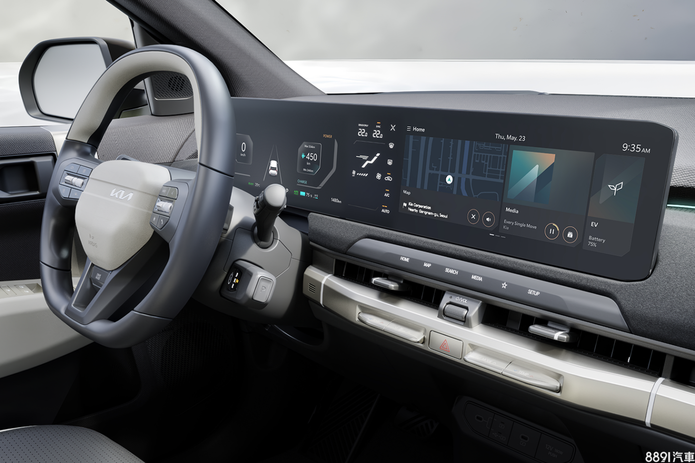 內裝除了有剛隨小改款EV6推出的新款雙輻式方向盤,儀錶台包含飾板造型、氣氛燈條和空調出風口等設計,都以水平鋪陳為主,透過橫向線條的延伸,能讓座艙在視覺上比實際更寬敞。