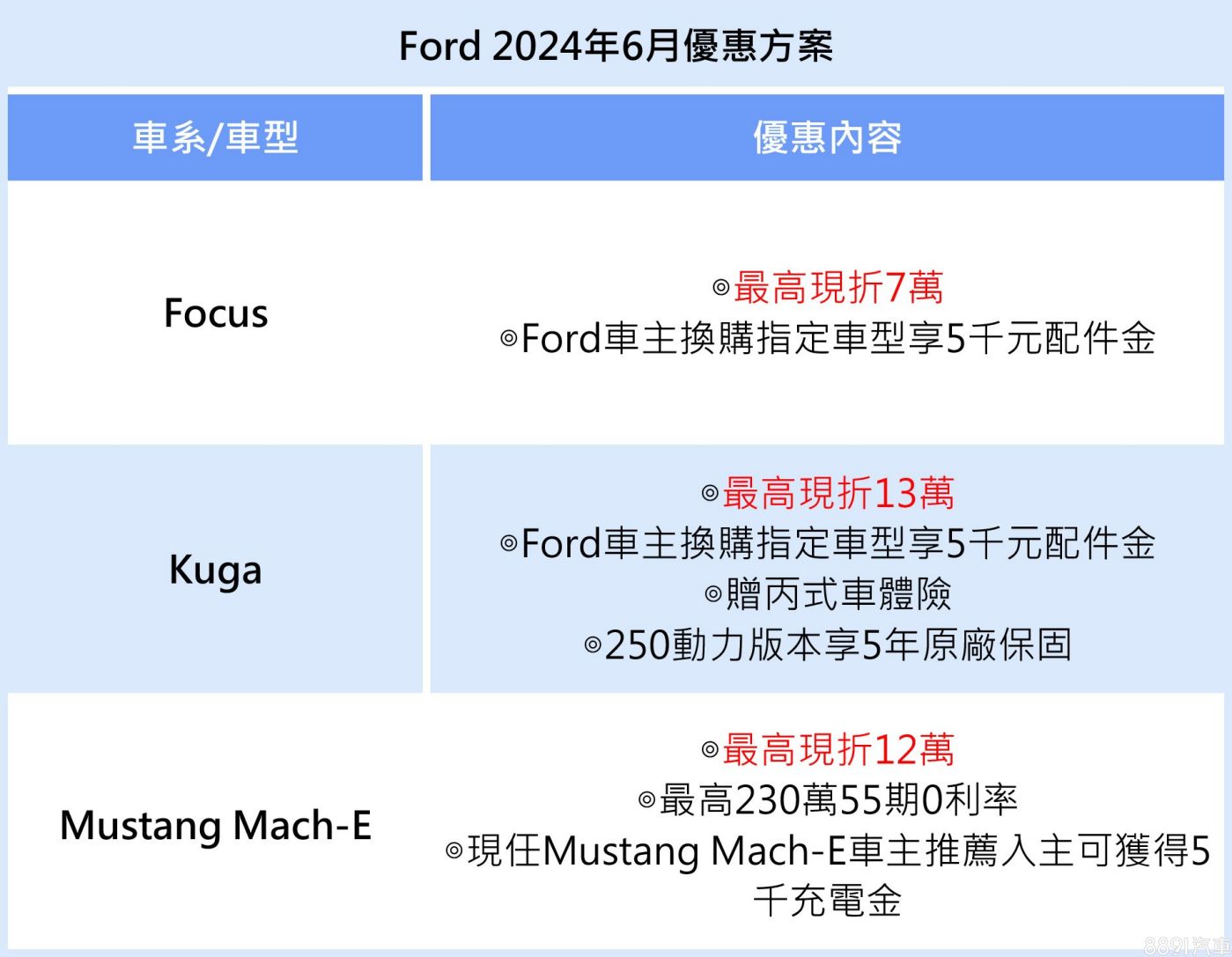 2024年6月1日至6月30日止,Focus全車系依車型不同,優惠4至7萬不等,若搭配政府舊換新專案,最多可省下12萬。Kuga主力180動力版本,優惠10至11萬;而250動力車型,更可享多達13萬的折扣,除了同樣能搭配舊換新,還有五年原廠保固、5千配件金等活動。