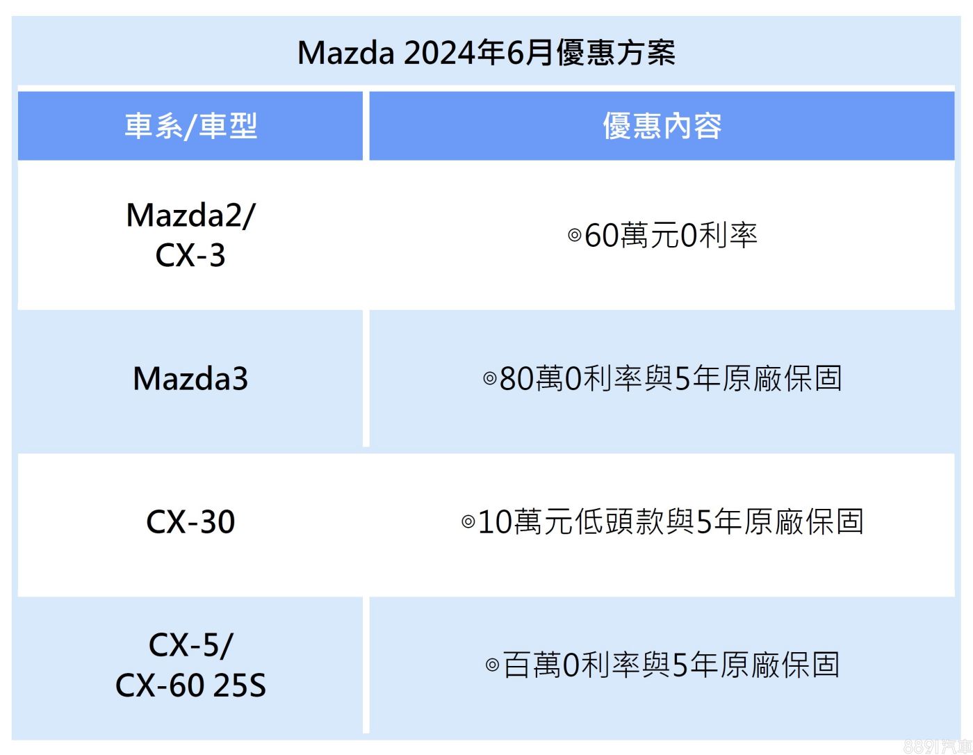 台灣馬自達為旗下車系提供限時購車優惠,6月購入Mazda2、CX-3等車款,可享60萬0利率專案,入主CX-30可享10萬元低頭款,就把新車開回家,還加贈5年原廠保固。