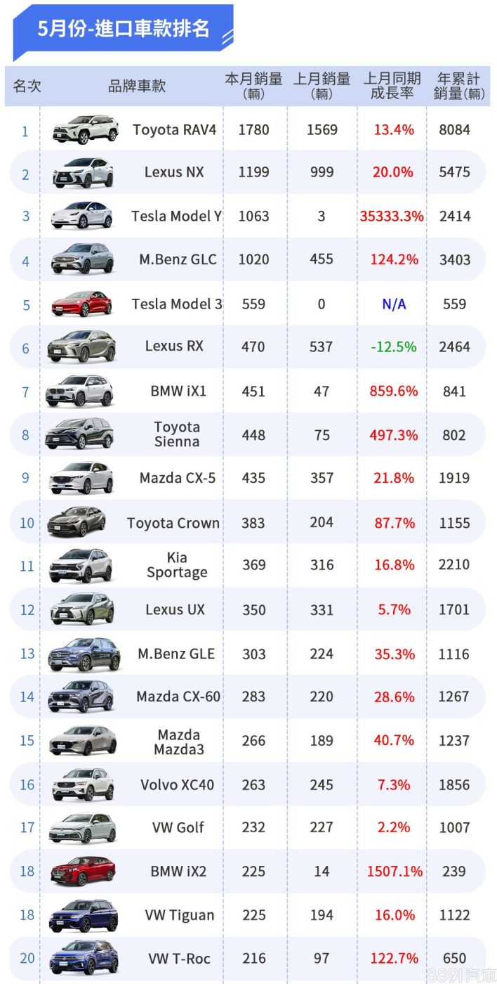 2024年5月登錄台數41477輛,相比4月成長了12%,除了和部分進口車廠大量新車到港有關,也與不少品牌競賽月開始有關,各家不外乎祭出強力優惠,此狀況在6月應會更加明顯,也讓人期待下個月份的掛牌數據表現。