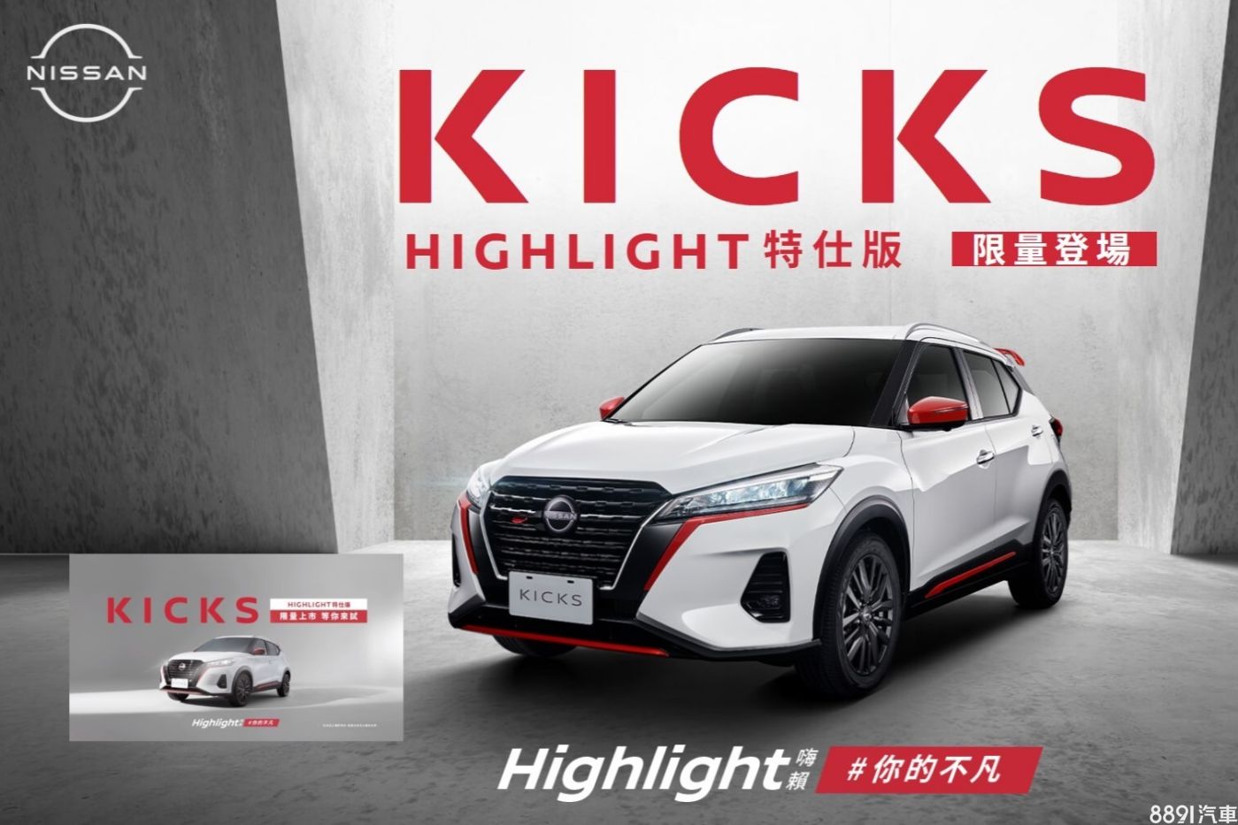 Kicks推出Highlight特仕版,是以現行販售的旗艦版為基礎做升級,售價維持85萬不變,採限時、限量的方式供應,僅販售350台。