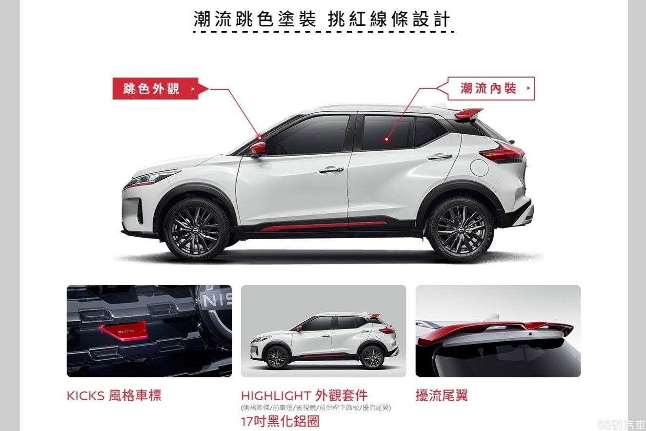 Nissan Kicks Highlight特仕版採用Highlight外觀套件,分別在前保桿下飾板、頭燈、後視鏡蓋、側裙飾條、後擾流尾翼添加鮮豔的紅色塗裝,搭配水箱護罩專屬車標、17吋黑化鋁圈等細節,視覺上十分引人注目。車內則延續外觀的跳色元素,加入紅色縫線點綴,同時座椅也換上黑灰雙色風格,搭配專屬Logo的頭枕及腳踏墊。