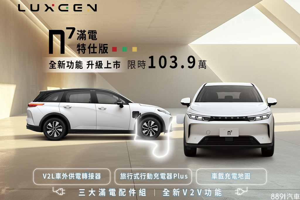 納智捷n7再次展開接單作業,限時推出n7滿電特仕版,提供會員專屬價103.9萬,以原先純粹版為基礎,加入首批車主最喜愛的配件組合,包含:旅行式行動充電器 Plus、 V2L 車外供電轉接器、車載充電地圖。