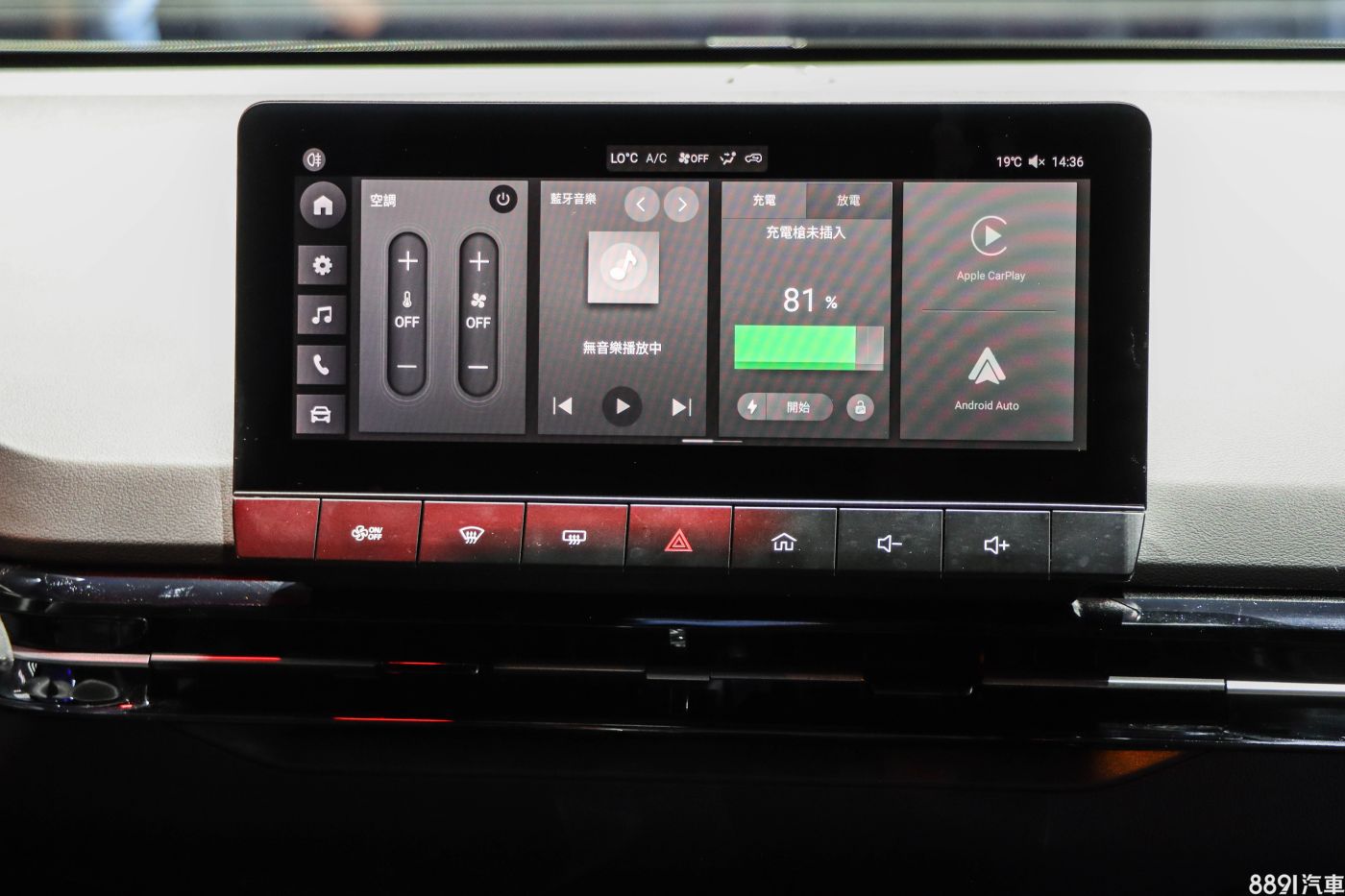 10.25吋多媒體觸控螢幕具備中文化顯示,主畫面採切割畫面,由左至右分別為空調、藍芽音樂、充電介面、手機連接功能,不過Apple CarPlay與Android Auto均為有線連接。