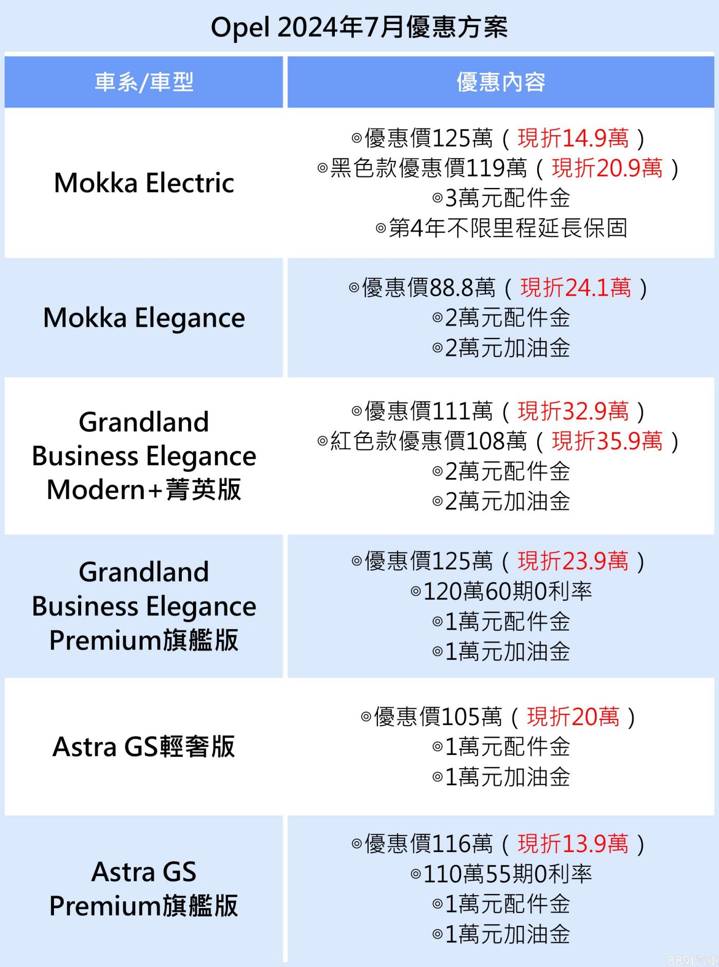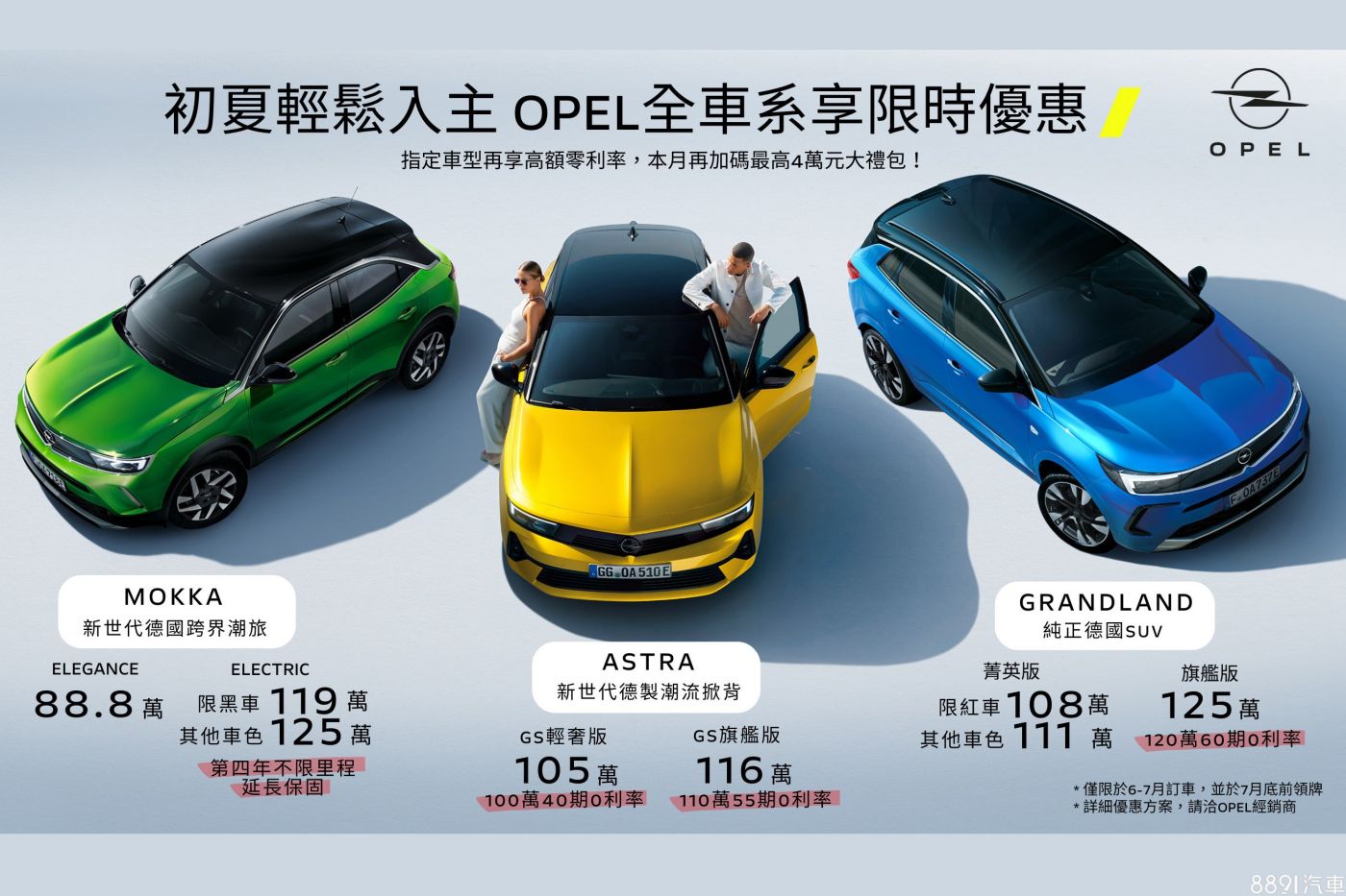 只要在7/31前入主Opel全車系指定車型,除了有低頭期款、高額0利率,以及配件金與加油金等方案,價格也「殺很大」,Mokka車系最多現折24.1萬;Astra車系最大優惠20萬;而Grandland指定車型更可下殺近36萬元!若至全台據點或品牌體驗館,完成任一車型試駕,亦贈送「全家霜淇淋」乙支,數量有限,送完即止。