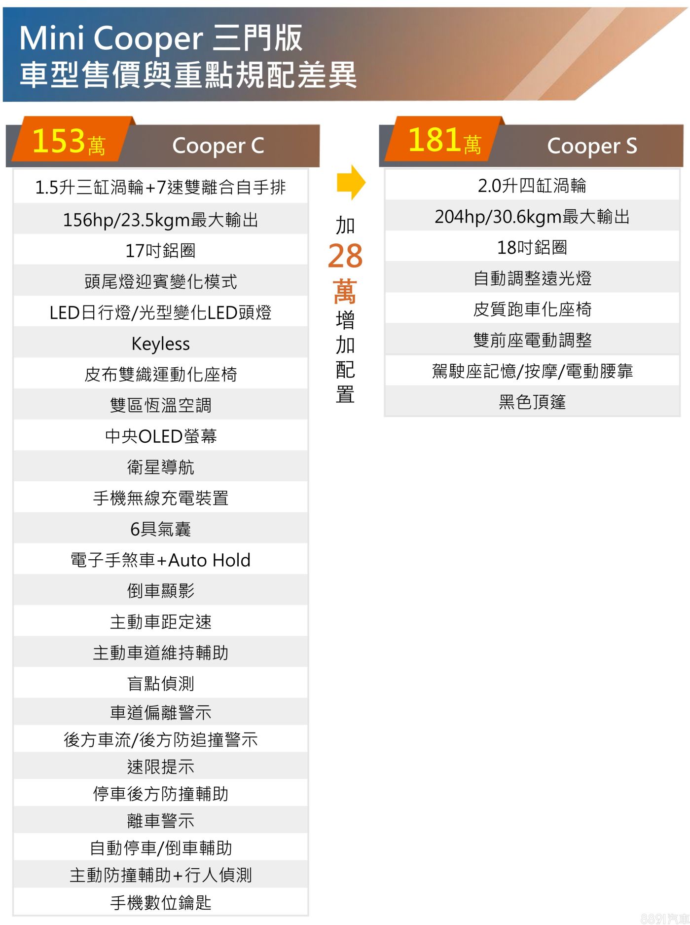 繼今年早一步登台的大改款Countryman後,新一代「Mini掀背」也於今(21)日在國內上市!車系隨改款正名為「Cooper」,導入「Cooper C」和「Cooper S」兩款三門車型作為首發陣容,定價分別為153萬和181萬。