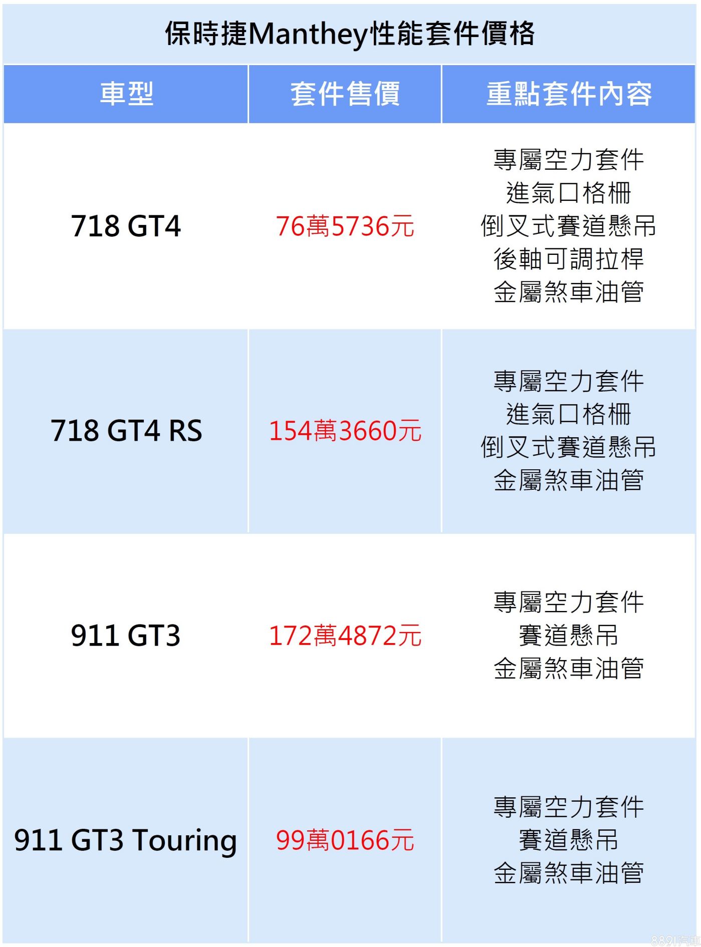 目前台灣保時捷針對911 GT3、GT3 Touring、718 GT4、718 GT4 RS四款車型引進Manthey性能套件,套件內容均針對各車型單獨開發,空氣力學與懸吊設計調校截然不同,因此各車型套件的價差也很大。