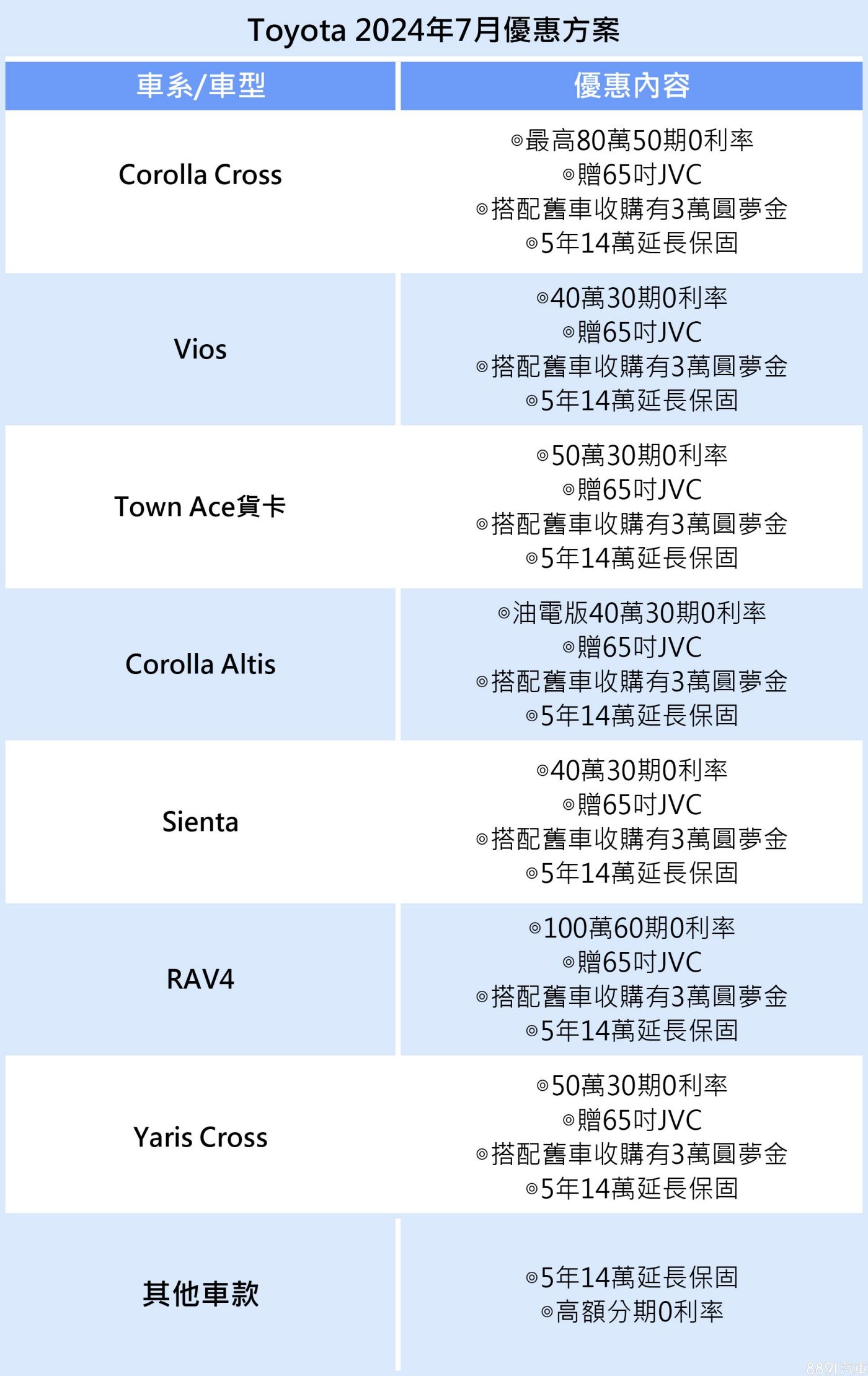 即日起至7月底止,入主Corolla Cross、Vios、Town Ace、Corolla Altis、Sienta、RAV4、Yaris Cross等車款,都贈65吋JVC智慧連網液晶顯示器,同時可享最高100萬高額0利率、3萬舊車收購圓夢金及延長保固等、總價值超過15萬元。