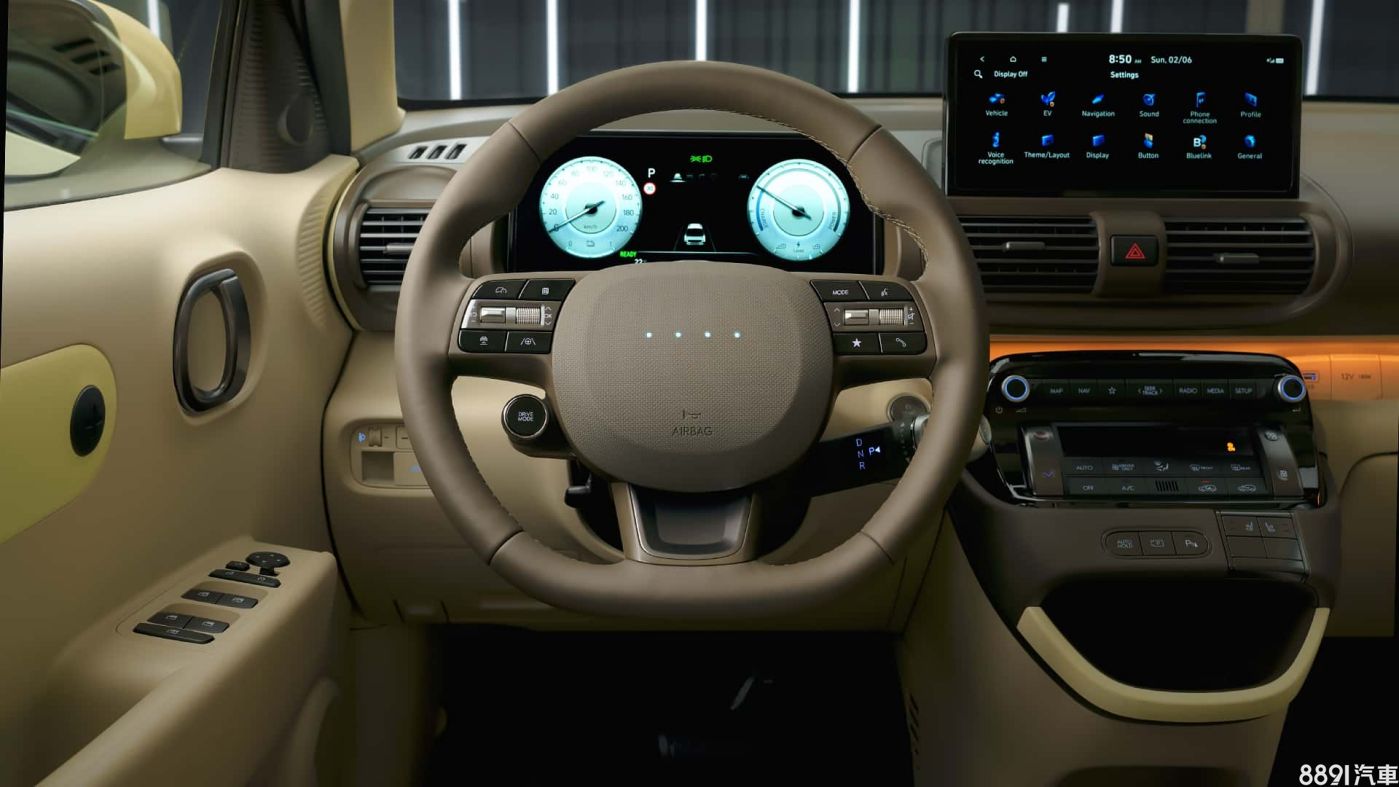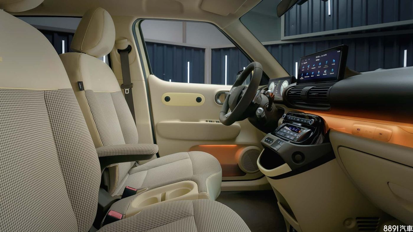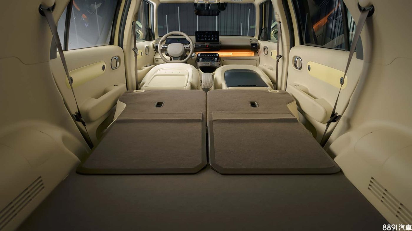 Inster前座採左右開放式設計,而且所有座椅都可以折疊平放,讓小車也可以有高機能空間,加上米色內裝、織布座椅,還有微型車少有的64色氣氛燈,令人感到放鬆且舒適,內裝另有黑色、卡其棕兩種配色。
