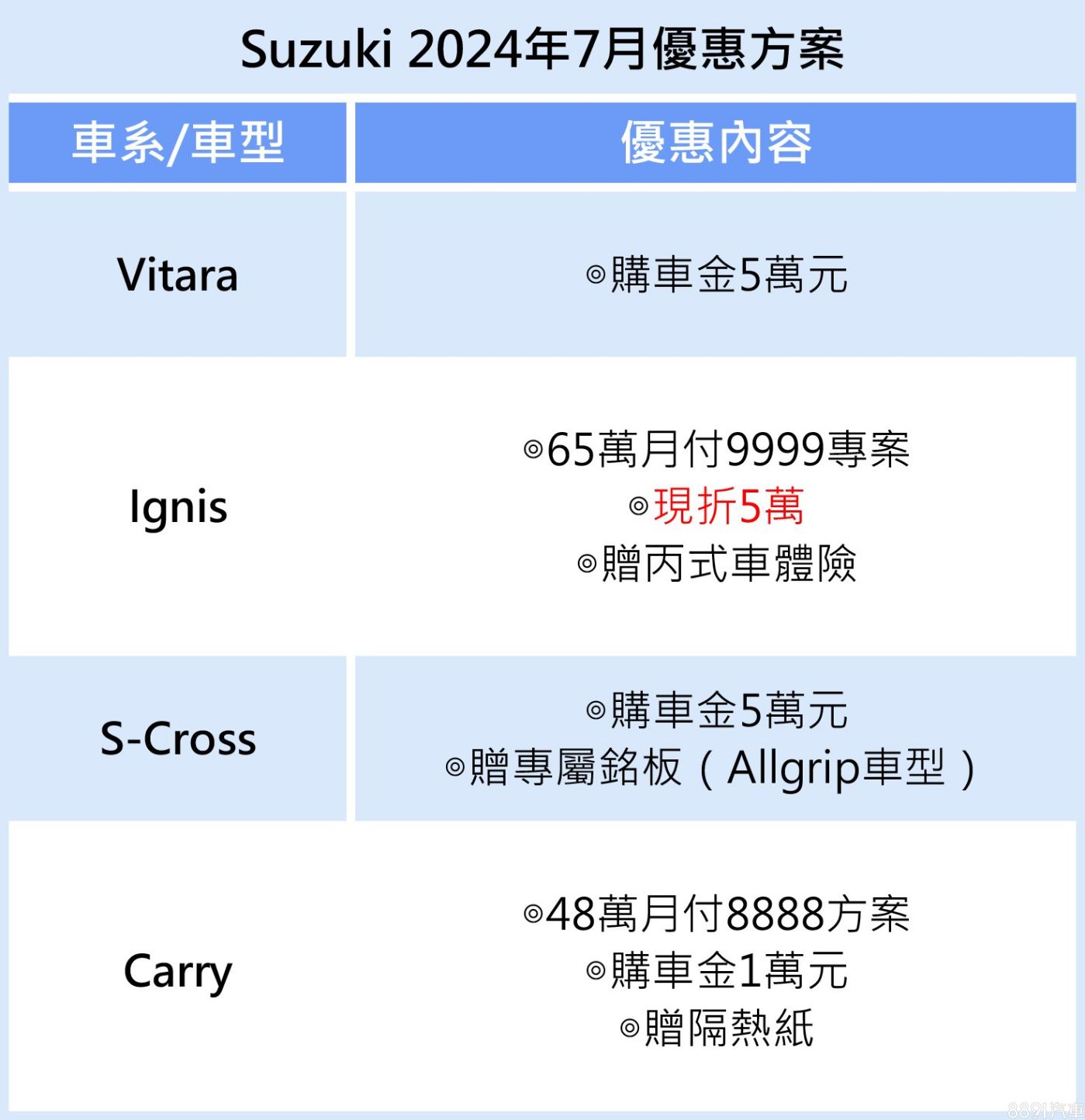 另入主Vitara、S-Cross也有5萬購車金回饋,另依車型不同,再送丙式車體險、隔熱紙等。來店賞車就送哈根達斯冰淇淋,消暑過炎夏!