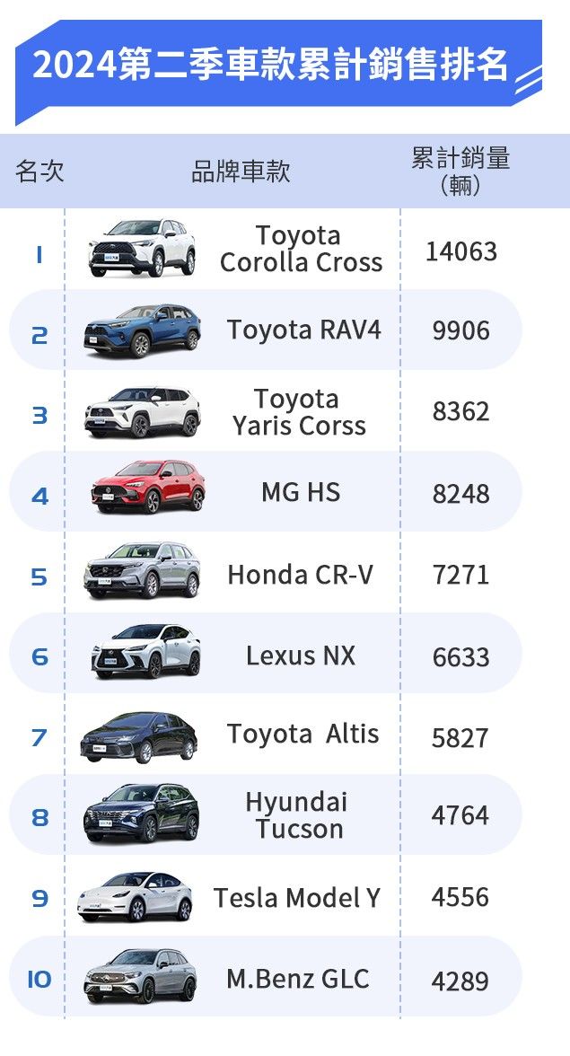 2、2024第二季台灣暢銷車排行 前三都是牛頭牌、豪華休旅表現強勢