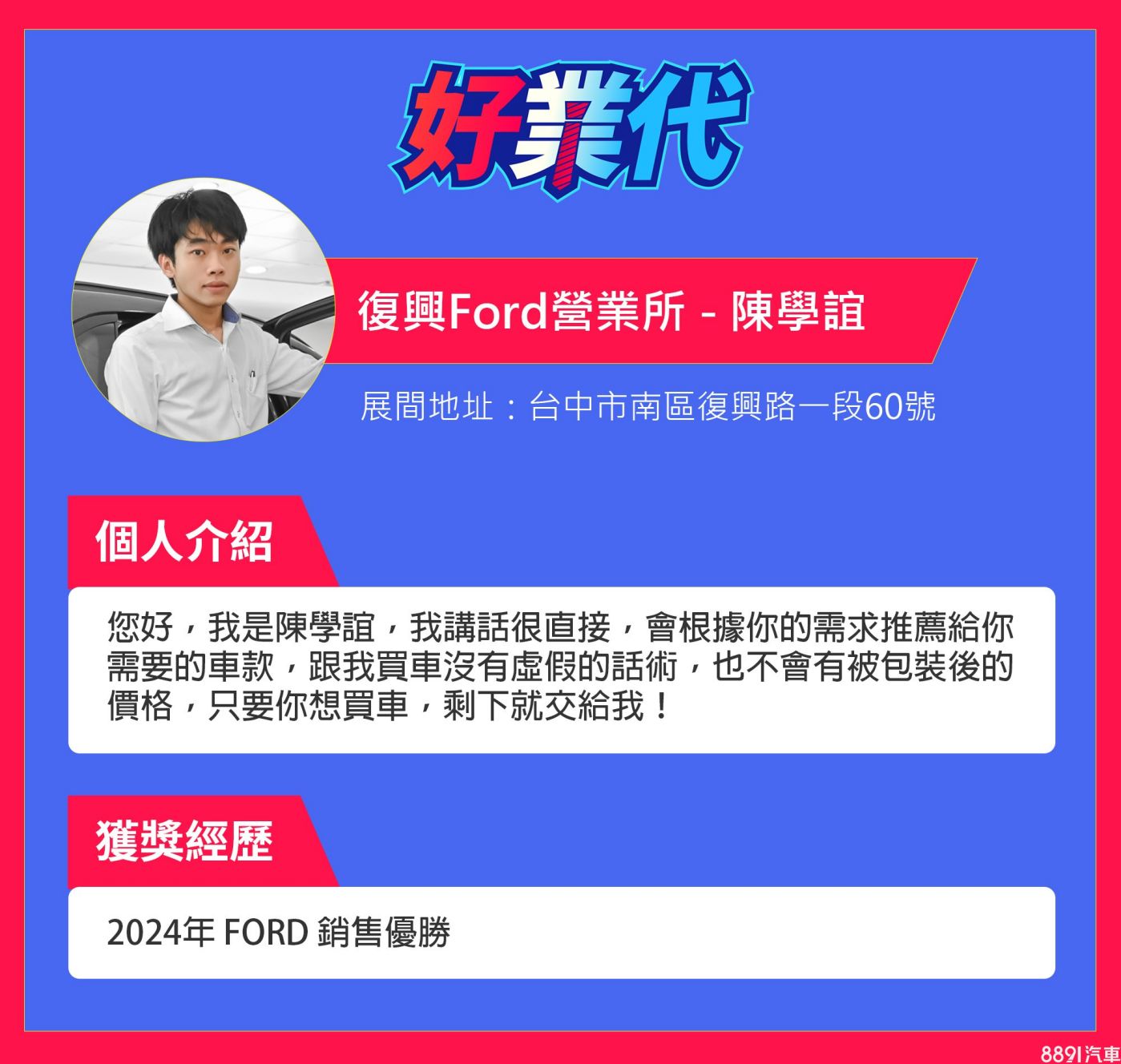 入行剛滿半年的學誼可以說是出身「名門」,因為他的父親正是Ford台中復興營業所過往的銷售王牌,如今他也「子承父業」延續家中的銷售基因,不過學誼也坦言:「這個身分其實帶給我不少壓力,畢竟不能隨便砸了爸爸的招牌!」。